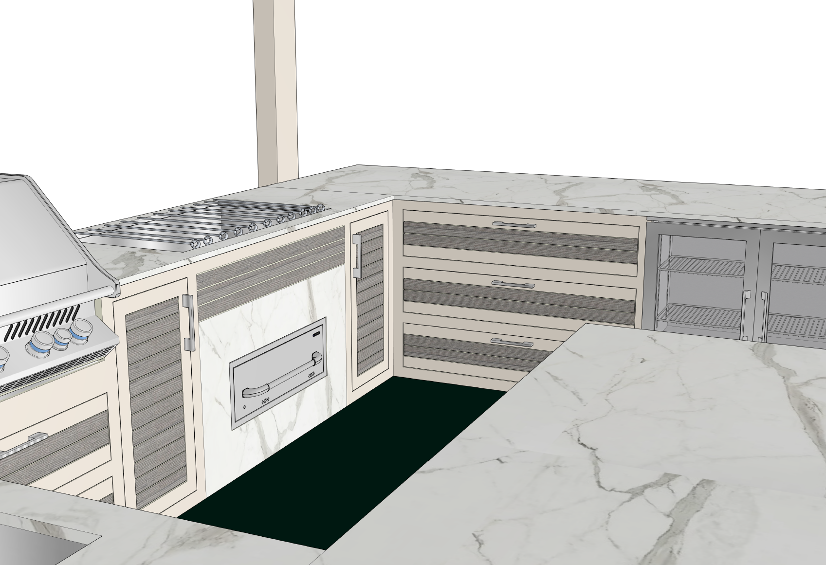 the frame colour of the cabinets needs to be hex colour eae3d7 in a matt powder coat the wood slats inside the doors need to be an textured white with small flecs of grey the doors need to include the outdoor frame colour the floor needs to be a light decking