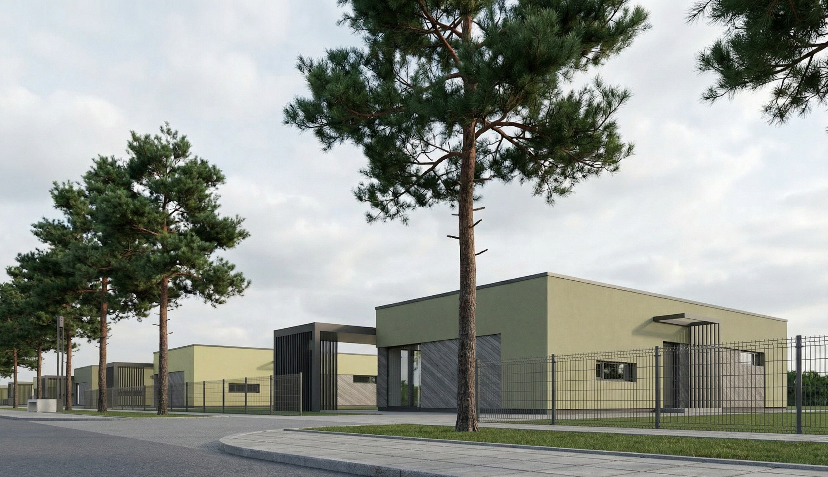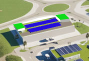 contemporary warehouse with beige columns and glass openings there is two green roofs and solar panels on the roof the facade facing us is the loading dock with trucks
