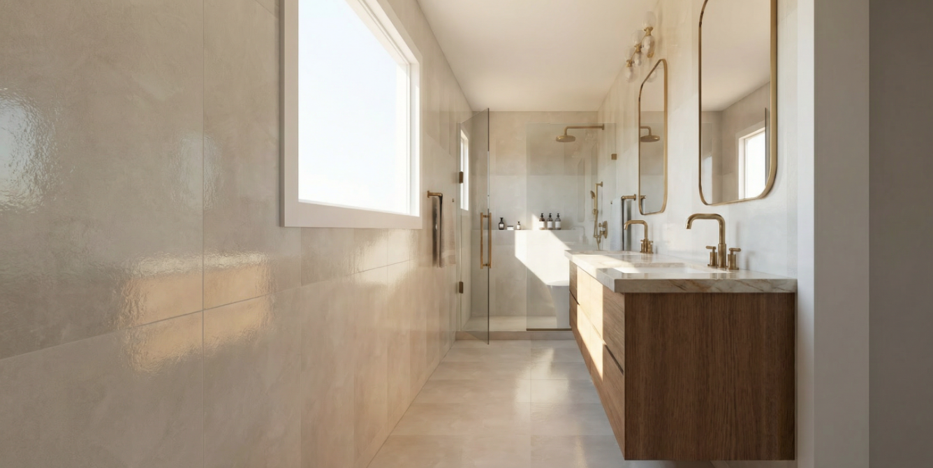 julian tile clay calm white tile on all walls and floor white oak vanity drawers with taj mahal quartzite countertops keep everything the same in the image but change tile to matte finish