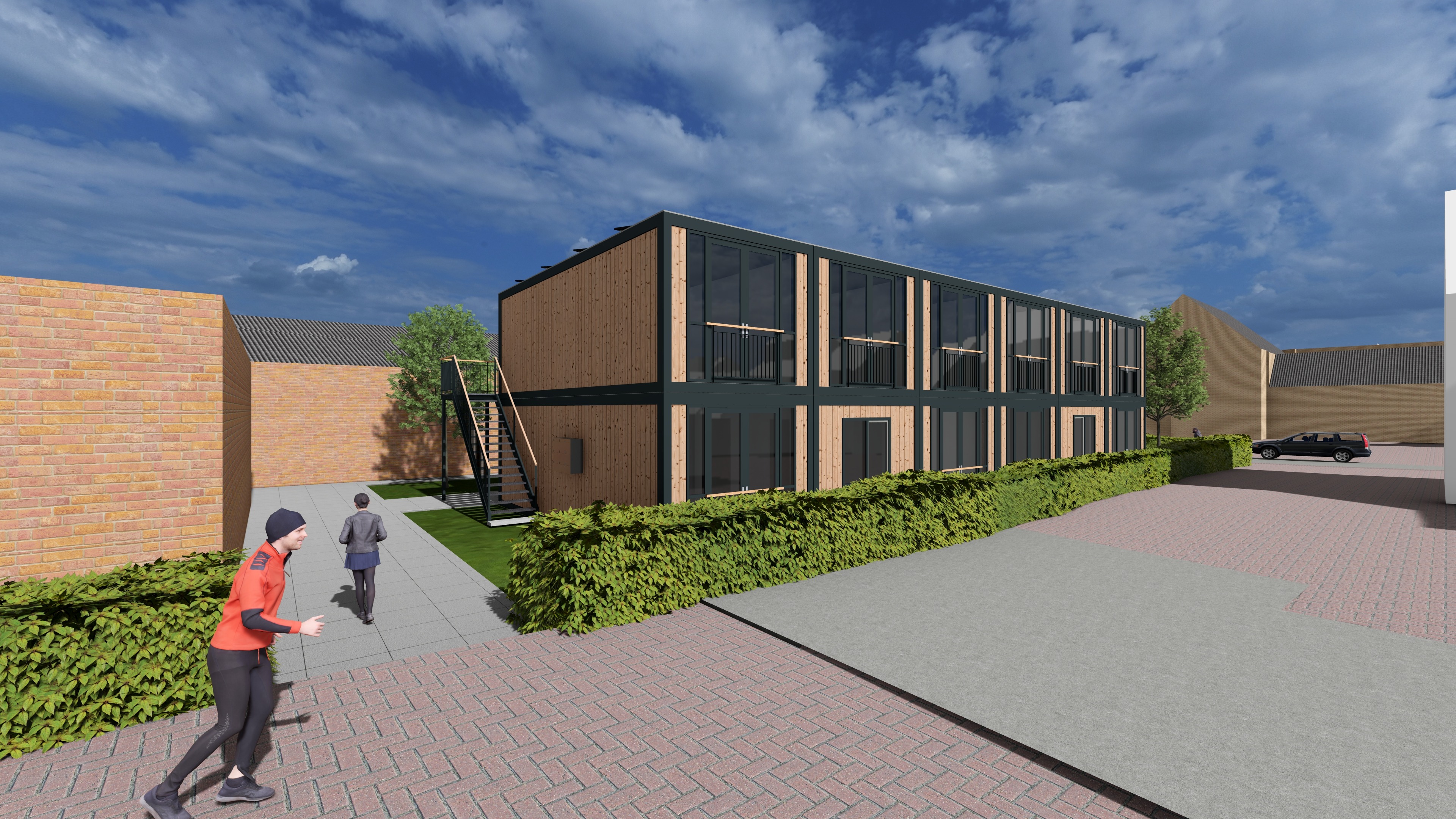 please update the quality of this render make it more detailed canyou add some greens on the french balcony ad add and two purple hortansia s in the hedge