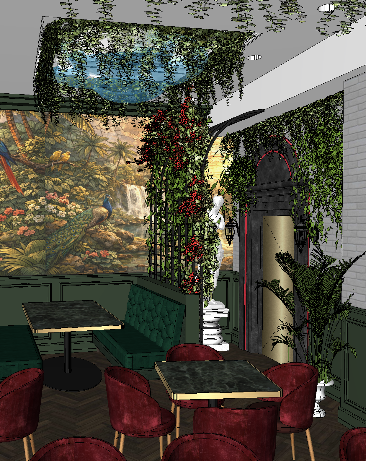 hyper photography ai control prompt ultra photorealistic architectural interior photography of a botanical corner seating area inside seven restaurant the image must preserve the exact geometry layout and architecture of the reference scene with no redesign or changes to proportions the scene shows a lush corner dining vignette with a deep emerald green velvet banquette wrapping the wall in front of the banquette sits a square dining table with a polished dark marble surface and a brushed brass edge detail burgundy velvet dining chairs with slender legs surround nearby tables behind the seating area spans a large decorative wall mural depicting a vibrant tropical garden landscape with a colorful parrot peacock lush foliage and waterfalls the mural appears as refined high end wallpaper softly illuminated by warm interior light a sculptural metal trellis arch rises beside the banquette the trellis is densely covered with cascading botanical greenery consisting primarily of ivy vines and white wisteria flowers creating a lush botanical canopy the trellis structure integrates climbing plants that wrap organically around the metal frame behind the trellis stands a classical white statue sculpture on a pedestal adding a refined european garden accent to the interior composition adjacent to the trellis is a dramatic arched doorway framed in dark stone with subtle red accent lighting outlining the arch the door panel is brushed brass with soft metallic reflections beside the doorway stands a tall decorative indoor plant with elegant leaves above the scene the white architectural ceiling contains a recessed skylight opening showing dramatic cloud lighting with a grey blue sky effect and subtle lightning atmosphere cascading greenery of ivy and white wisteria hangs naturally from the ceiling edges around the skylight opening flooring is dark natural wood parquet with visible grain patterns and soft reflections from ambient lighting materials must appear extremely realistic velvet upholstery fibers polished marble table surfaces brushed brass metal details natural wood floor texture glass reflections on nearby surfaces botanical leaf translucency organic bark texture on plants and trellis greenery lighting combines soft daylight from the ceiling skylight with warm hospitality lighting from interior fixtures professional architectural photography camera setup full frame camera simulation 24 35mm architectural lens balanced perspective and strong spatial depth exposure must resemble real photography with natural highlights and soft shadows depth of field remains subtle to preserve architectural clarity no cgi appearance and no artificial rendering artifacts ultra realistic global illumination with soft light bounce between materials reflections appear naturally on marble brass and glass surfaces vegetation must appear organic with natural variation in leaf color and density liquids and glassware on tables show realistic reflections and refraction the environment should feel like a luxury botanical restaurant interior photographed for a high end architectural and hospitality design magazine hospitality amazing photography extremely realistic materials cinematic depth hyper photographic rendering quality with refined luxury hospitality lighting subtle bloom around light sources layered depth across foreground midground and background and high end magazine photography realism