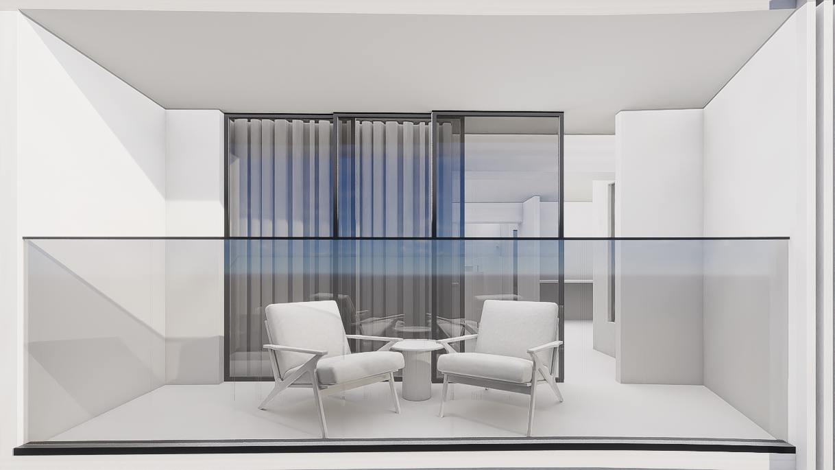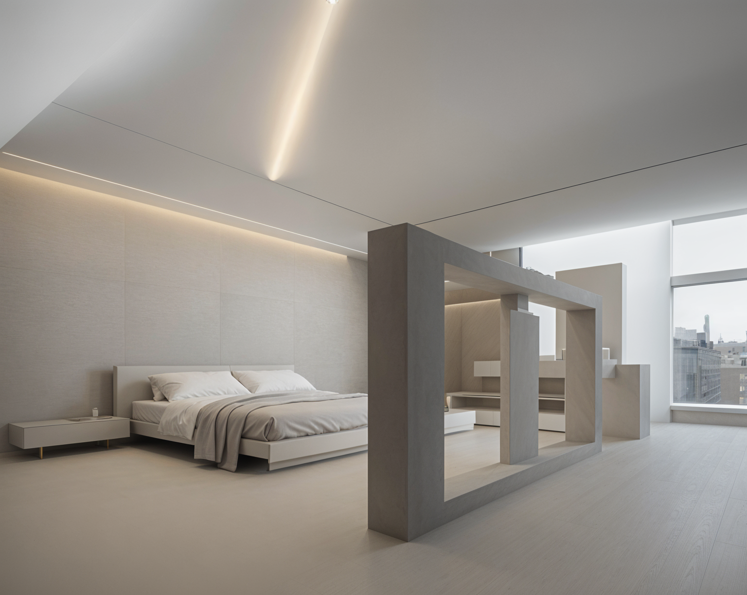 zaha hadid interior shot render a serene and elegant modern bedroom the bed features soft light gray linens with a textured gray throw blanket the walls are a soothing beige complemented by a light wood panel accent the floor is a light ash wood finish the backlit wall behind the bed casts a warm ambient glow a sleek minimalist beige couch with cylindrical cushions sits beside a small round silver metallic table holding a green wine bottle and glass create an atmosphere of tranquility and contemporary sophistication with balanced neutral tones throughout architecture