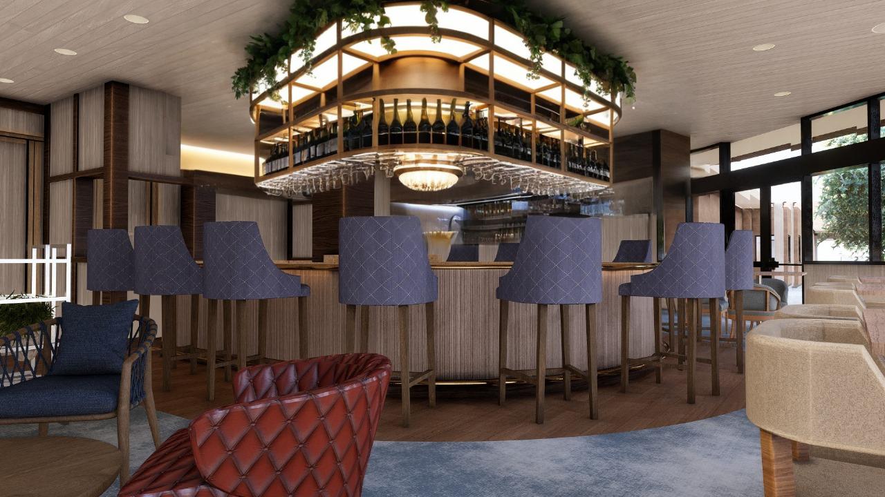 a realistic view of a country club bar the bar is round with wood slat panels and the glass rack above is round with brass finishes architecture