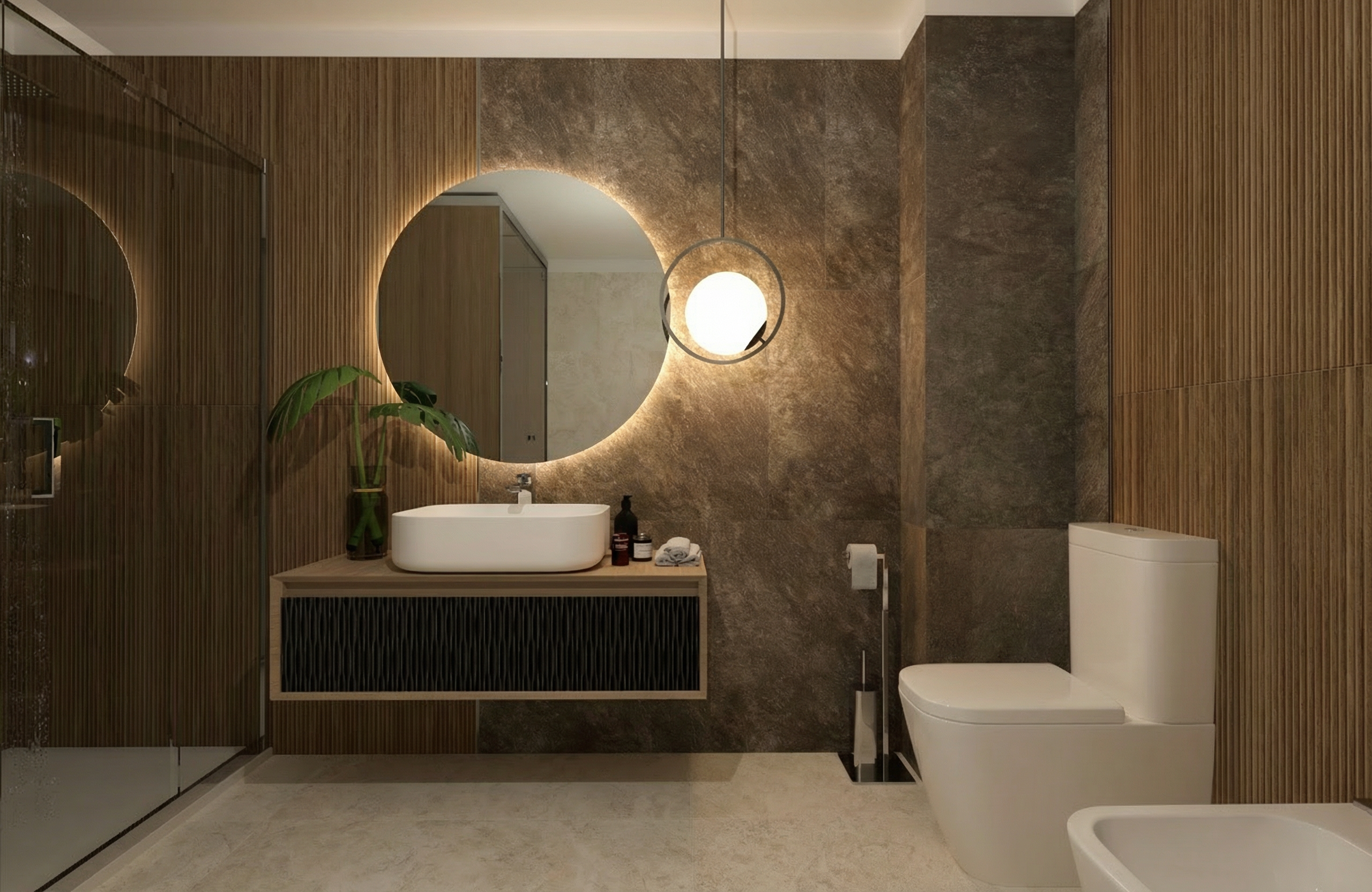 do not change the geometry and colors and materials put to the left wall put a black sink which is part of the shelf the shower is black matte