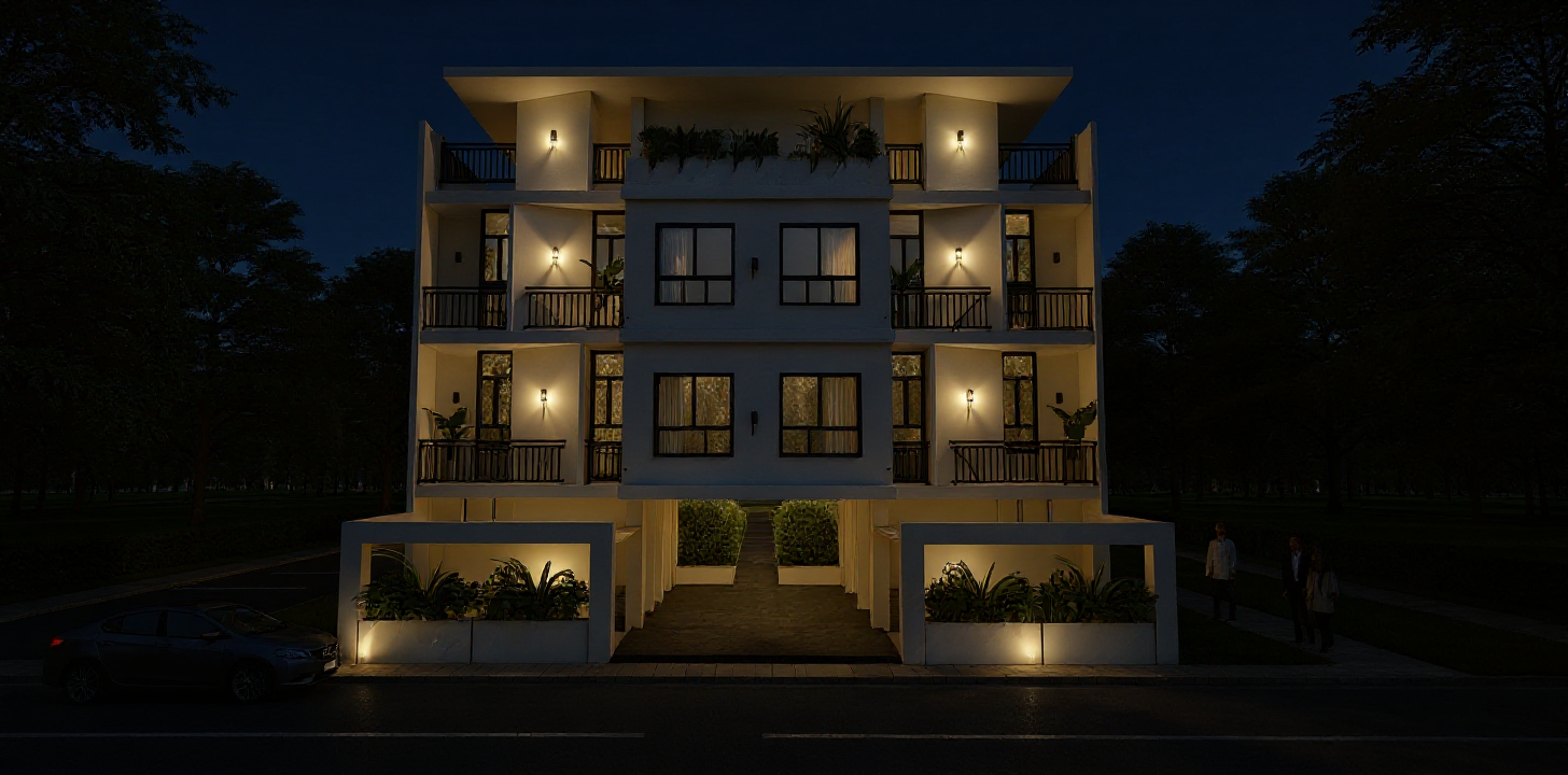 light up all 12 wall lamps in the facade add top recessed lighting on the 4th floor lighting the plant box in the 4 th floor add top recessed lightiing to light up plant box in the ground floor theres also 5 wall lamps on the 2nd and 3rd floor light them all