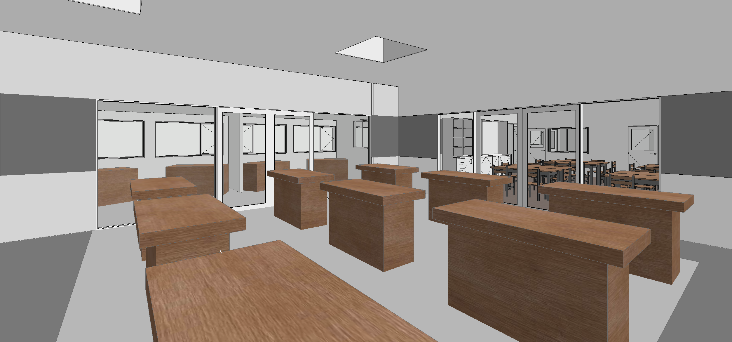 interior classroom view with grey vinyl flooring grey strip on walls and wood working tables