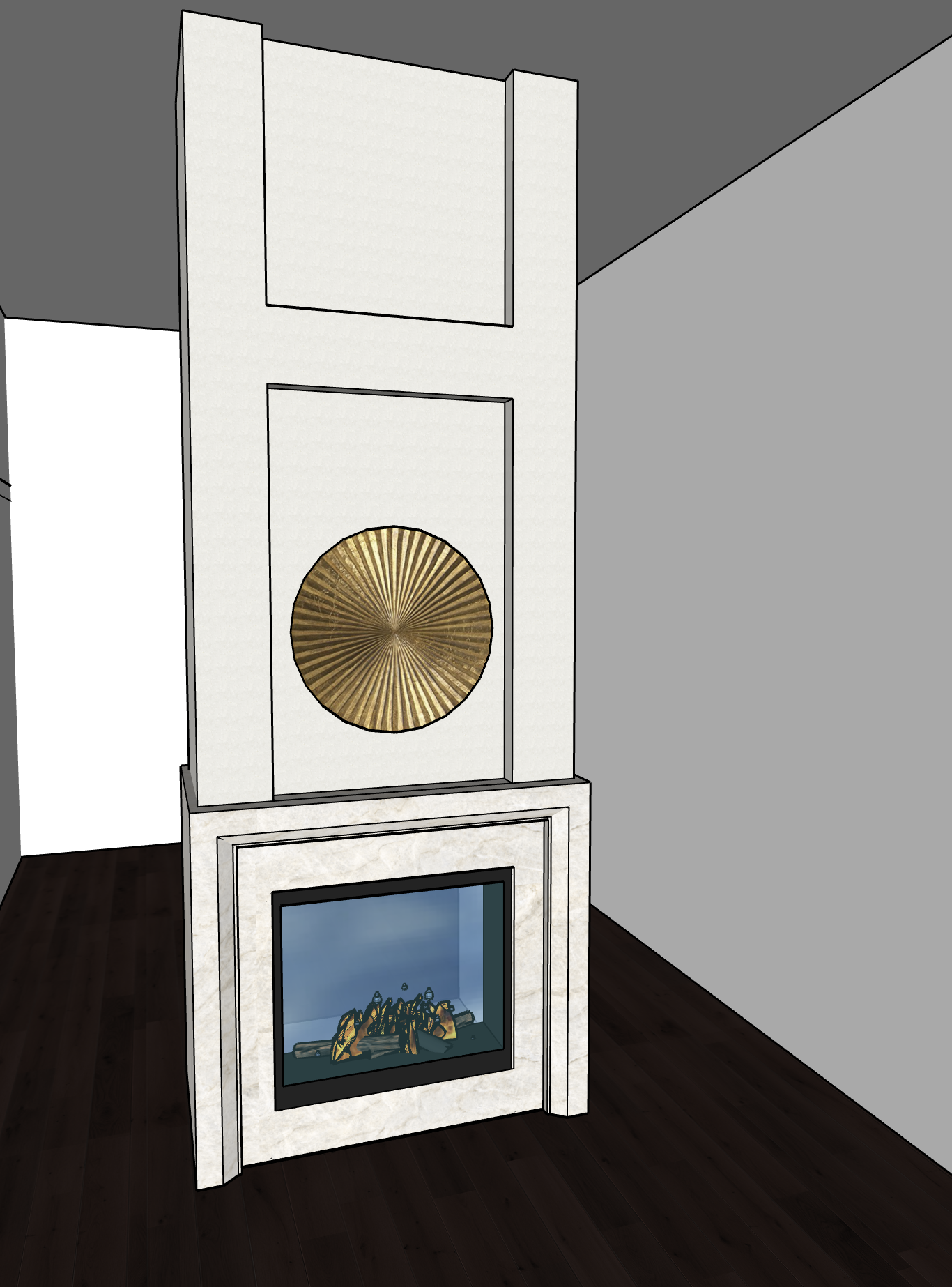 photorealistic interior render of a modern fireplace feature wall maintaining exactly the same geometry proportions layout colors and design as the reference image no changes to shape dimensions trims profiles artwork position or fireplace insert fireplace surround and base finished in taj mahal marble with soft creamy beige tones subtle warm veining natural stone variation satin honed finish realistic marble depth and mineral translucency only the fireplace architectural wall the vertical feature wall above and around the fireplace opening finished in smooth plaster texture matte off white handcrafted look with very subtle irregularities all remaining walls trims and surrounding surfaces stay solid white clean and uniform with no plaster texture applied integrated black glass fireplace insert with realistic flame reflection and depth circular gold decorative wall art centered above the fireplace unchanged in size color and position clean architectural millwork details preserved exactly as shown lighting soft natural ambient lighting gentle shadows neutral white balance camera eye level perspective with slight upward angle architectural photography style environment dark wood flooring neutral space no additional d cor style ultra realistic high end interior visualization physically accurate materials and lighting do not add remove resize recolor or modify any element material realism only design must remain identical to the reference image