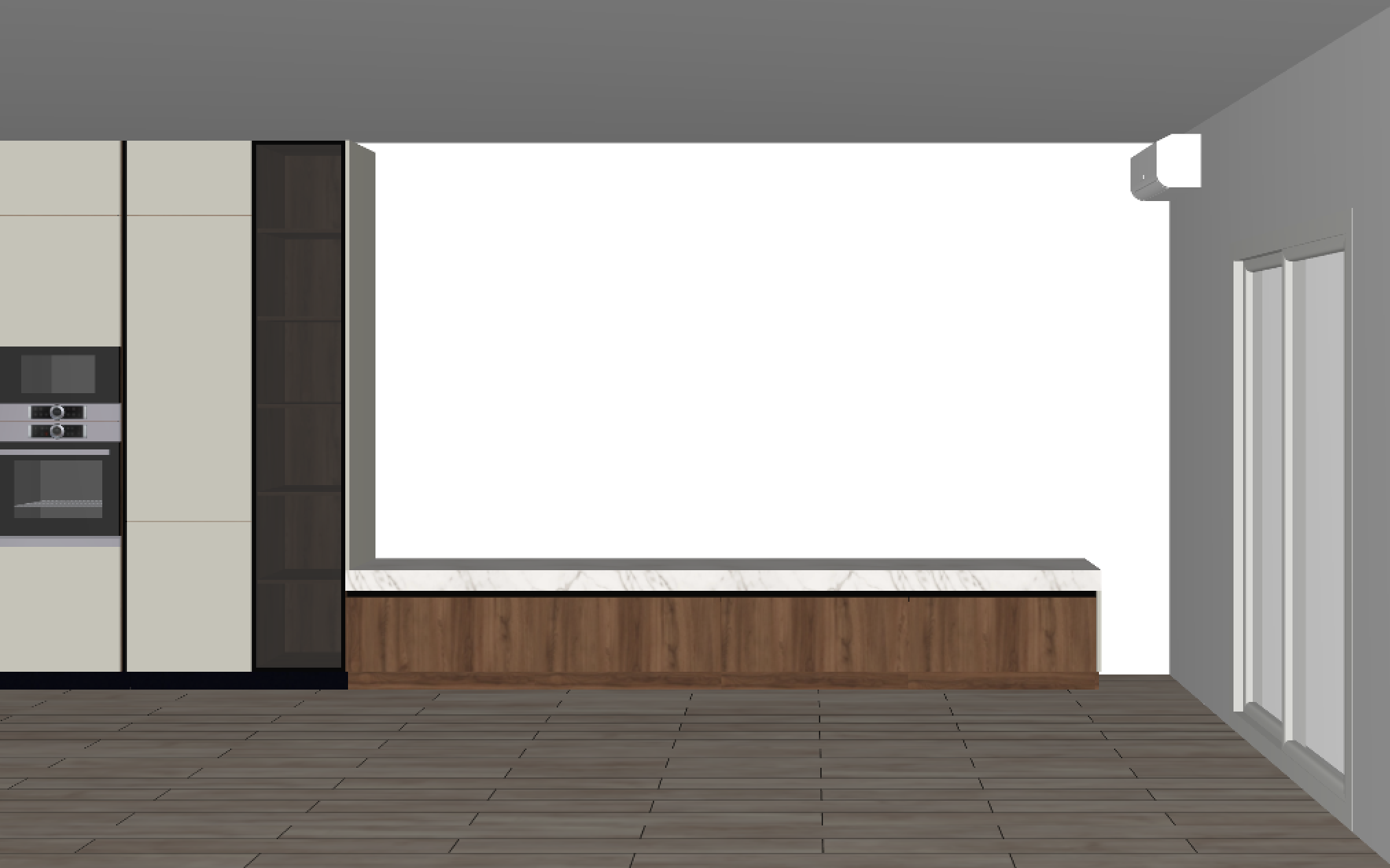 modern kitchen interior sleek and minimalist design the cabinets are in a warm beige color with dark brown wooden accents marble countertop with subtle white and gray veining stainless steel oven and microwave built into the cabinetry smooth gray walls with a slightly lighter ceiling the floor is a dark wood finish with natural grain patterns large sliding glass doors allowing natural light to create a bright and airy atmosphere