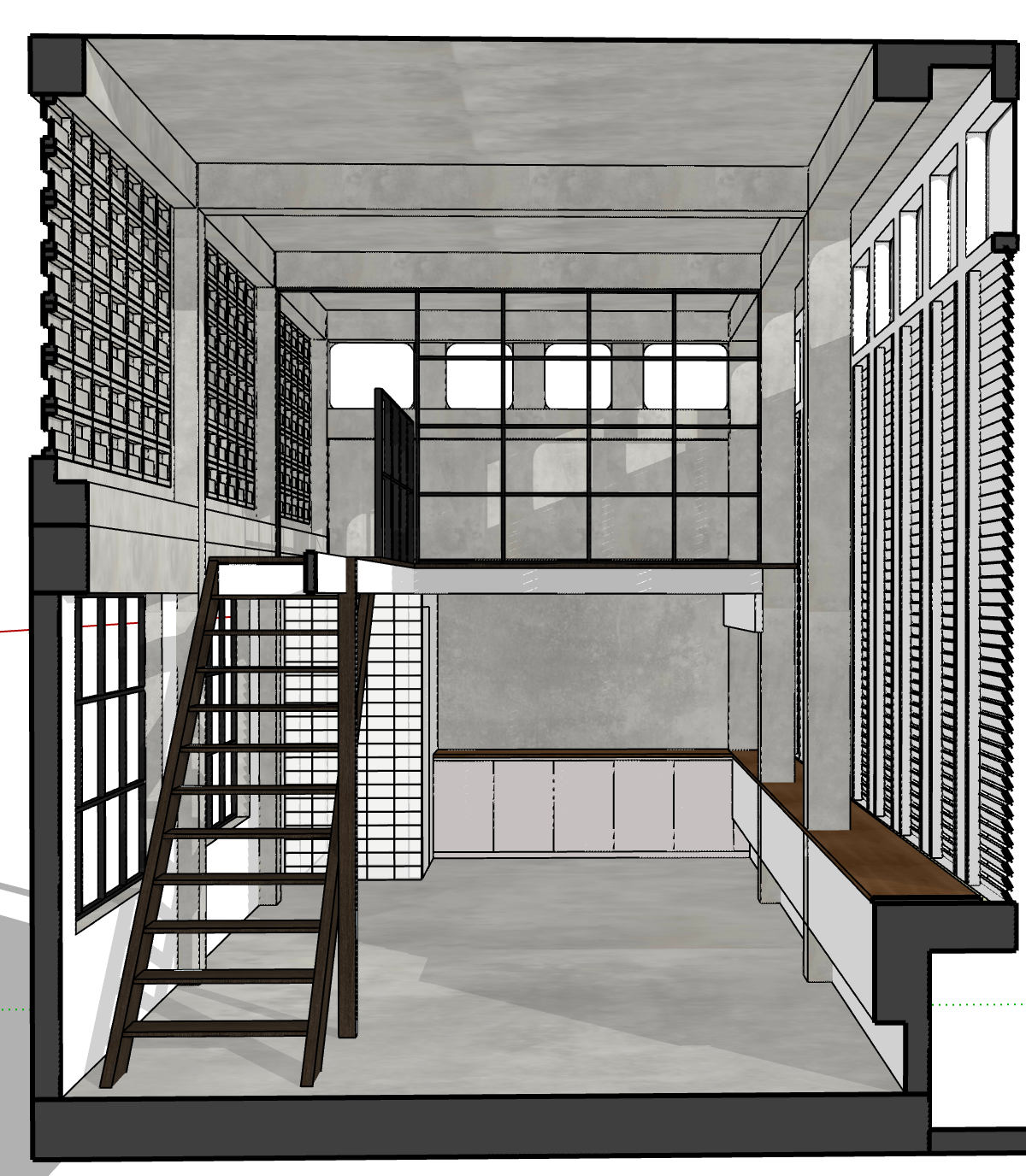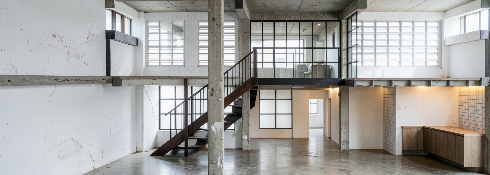 photorealistic industrial loft interior matching the provided architectural model double height space with mezzanine bridge and upper glass enclosed room dark walnut staircase leading to a narrow landing and elevated walkway long built in counter along the right wall below tall louvered windows exposed structural concrete beams and columns white mineral painted plaster walls with subtle aging polished worn concrete floor minimal contemporary cabinetry under the mezzanine scandinavian industrial aesthetic calm architectural photography mood 35mm lens eye level perspective straight vertical lines slightly rough limewashed white walls with tonal variation and micro cracks weathered concrete columns and beams with pores and patches worn polished concrete floor with soft reflection dark walnut stair matte oiled finish lightly worn edges wood countertop natural oak slightly aged realistic imperfections refined patina not dirty soft diffused daylight entering from tall side windows and upper clerestory windows balanced interior exposure gentle bounce light filling double height space clear air minimal haze windows bright but not blown out calm airy atmosphere concealed warm led uplighting integrated beneath the long wood counter along the right wall continuous strip from first column to last column soft upward wall wash revealing texture of white plaster and concrete columns warm 3000k subtle intensity secondary to daylight architectural magazine photography filmic tone mapping mid contrast preserved highlights lifted shadows natural color grading upper floor left wall is a ventilation air brick wall made of small rectangular masonry openings deep set blocks with thickness aged mineral plaster finish uneven lime residue subtle water stains and discoloration inside cavities softened edges from wear slightly dusty texture light passes softly through openings not decorative screen panel realistic masonry depth and shadow daylight partially filters through airbrick openings creating soft patterned shadow on adjacent surfaces