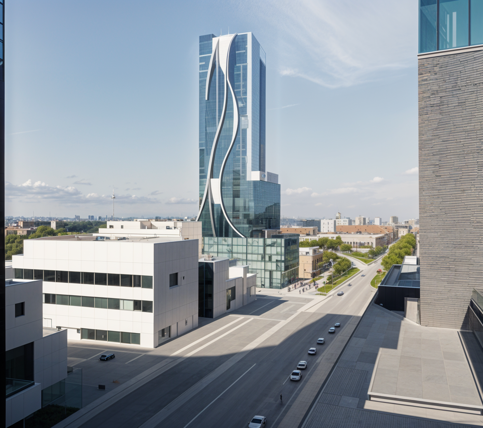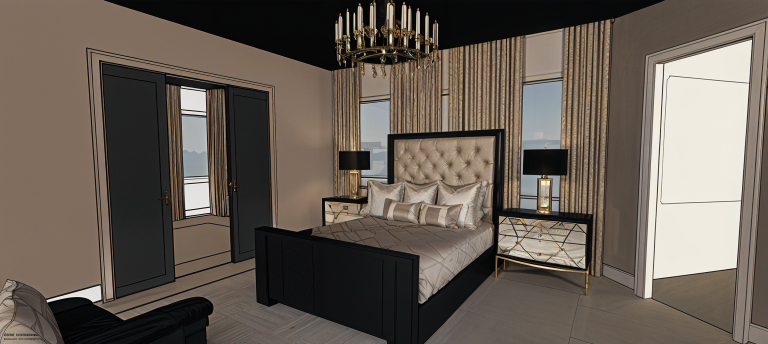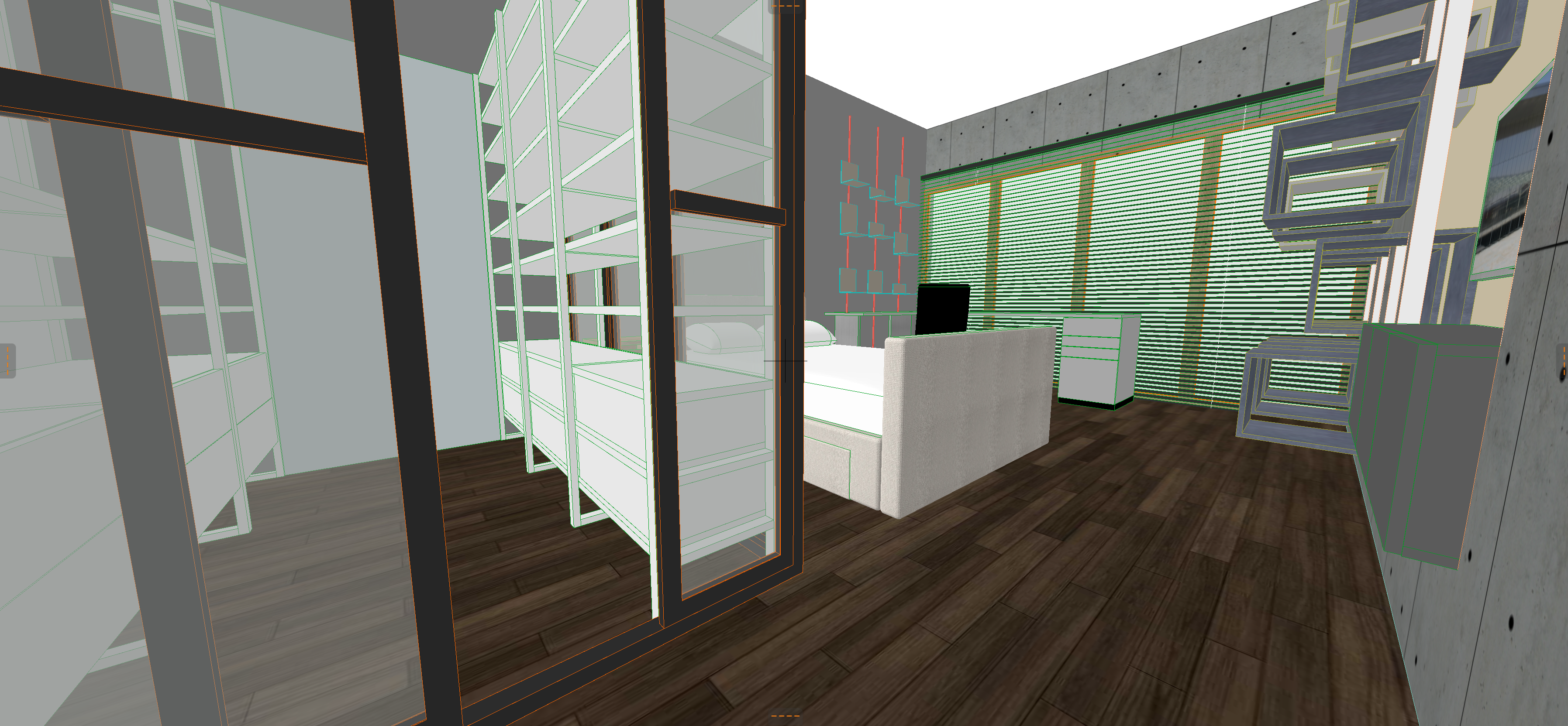 modern bedroom with a changing cabin inside in the middle is a bed a study desk in front of the window add a ceiling andlighting instruments hollow cubes are for books