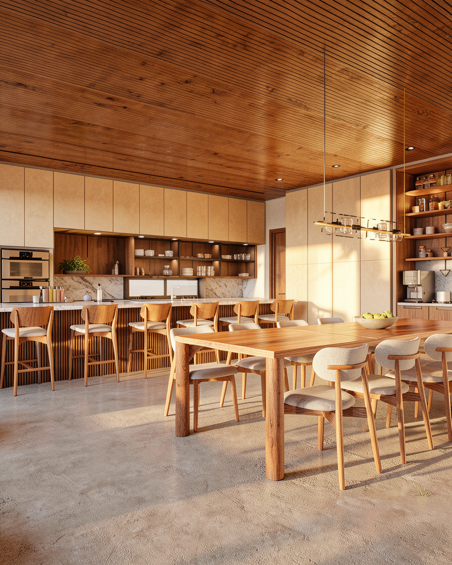 render realistic using white stucco with mixed brown color stone and black windows black accents black doors and black roofs set this is a residential neighborhood with large mature trees and very upscale landscaping provide shrubs and landscaping around the base of the house make the surround of the front door black and make the time of day dusk with lights add outdoor lighting next to front door and can lighting in the soffits add a driveway going to the side yard on the right side