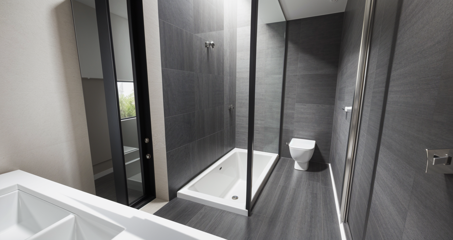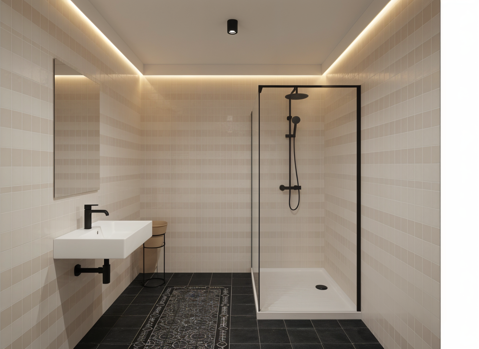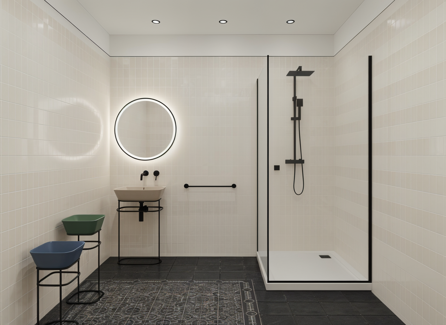 small bathroom without window use these products one basin on the left side shower in the right back corner with black faucets and black shower tray the black tiles are for the floor use the exact products in the moodboard use only one basin on the left wall it is an old countryside building please do it less modern