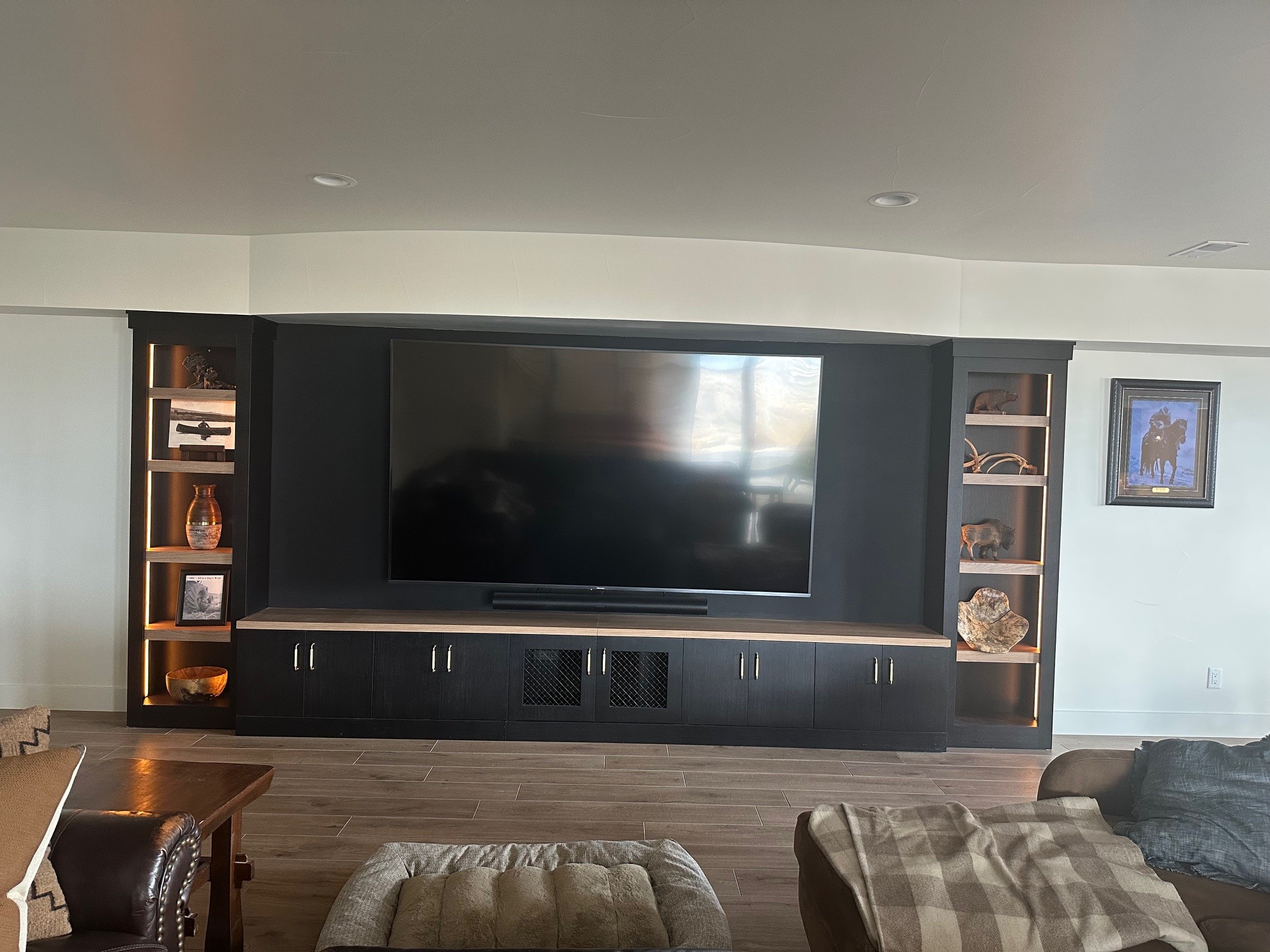 do not change the cabinets in any way preserve the exact cabinet colors materials finishes dimensions door and drawer styles hardware spacing alignment and all geometry exactly as shown do not alter the countertop shape backsplash appliances flooring lighting fixtures or wall structure only remove the construction materials clutter and mess from the scene clean the room and make it look finished and staged add a few simple tasteful home accessories appropriate for the style of the space but do not add or remove any furniture windows or architectural elements maintain the original lighting direction and realism enhance clarity and polish the photo while keeping the cabinetry and room design completely unchanged do not alter the lighting to keep the cabinet colors as they are in the image stage this as a modern entertainment space with new furniture with a simple screensaver on the tv