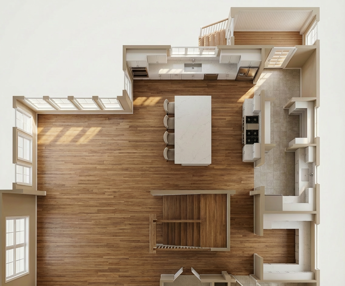 change view to look like i am standing at the the windows on the left looking at the kitchen