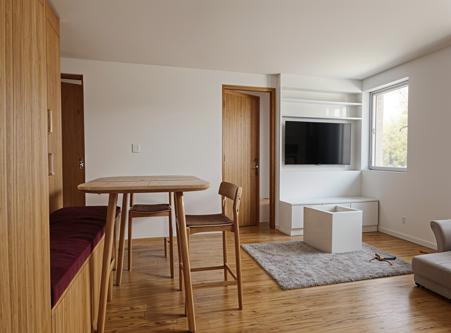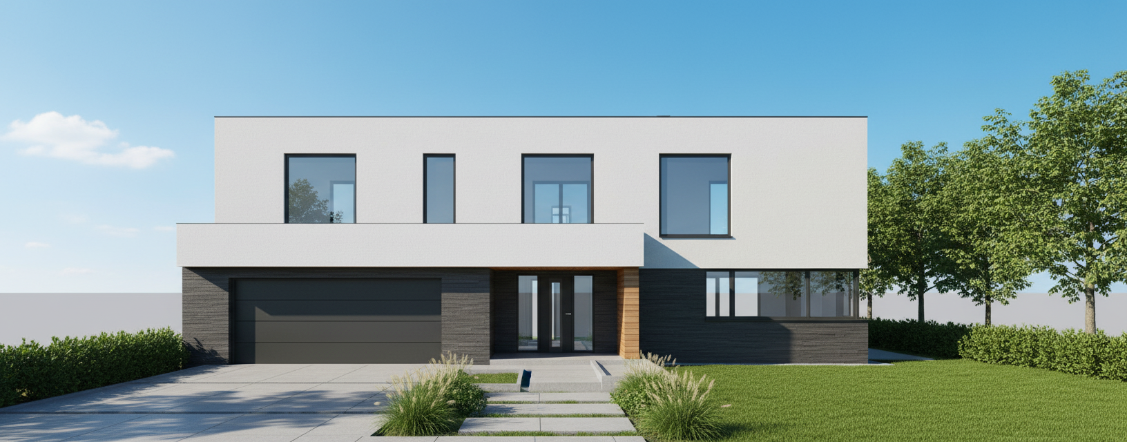 minimalism style white and dark gray plaster walls dark gray windows curtains in the windows