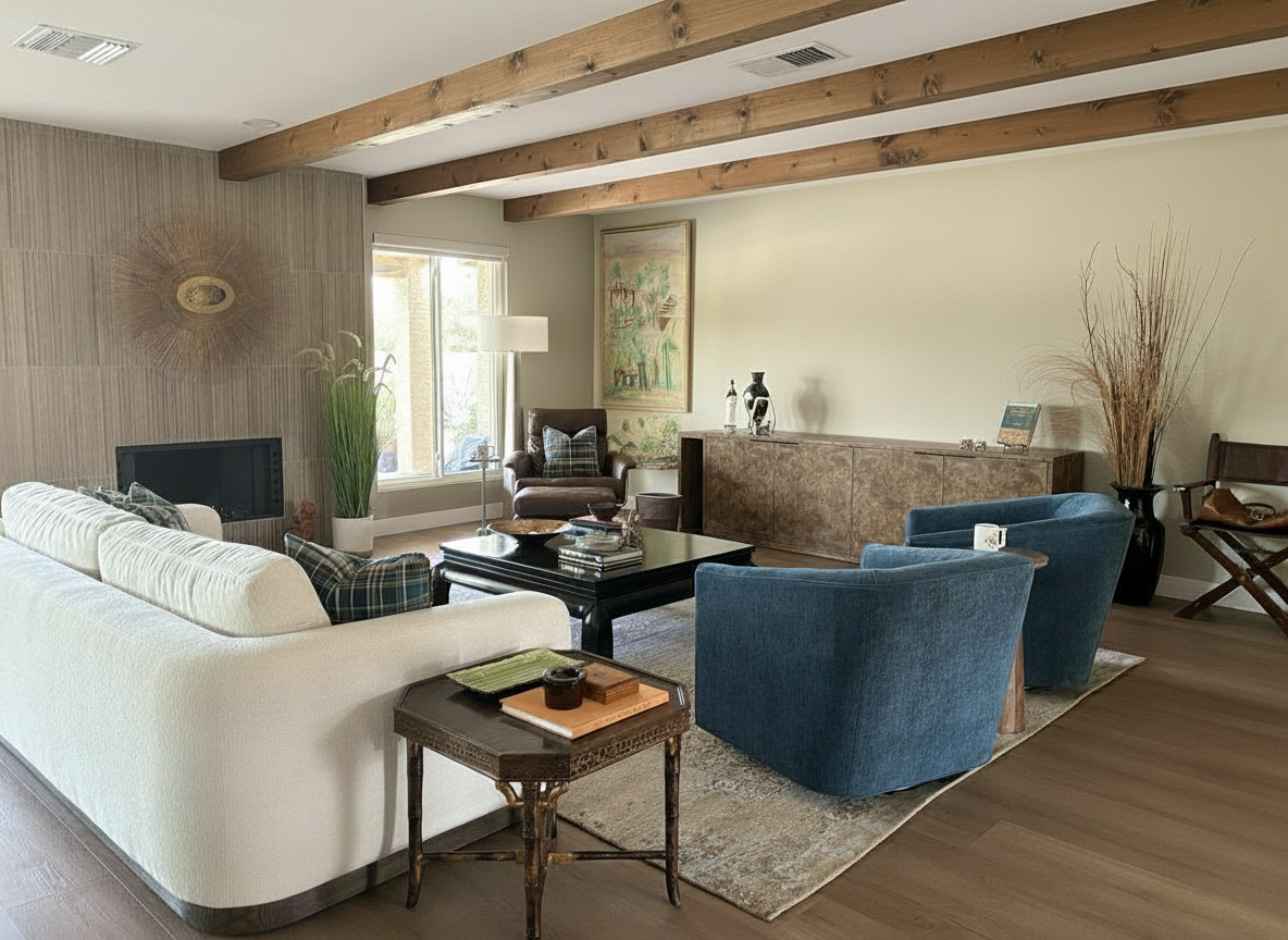 remove ceiling fan and add wood ceiling beams remove tv and add ceramic vase with tall branches with red leaves in the same place