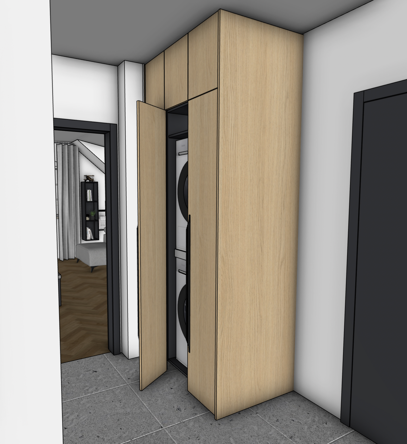 photorealistic render of the uploaded sketchup kitchen image preserve exact camera angle and all original textures materials no redesign add realistic sunny daylight from outside with global illumination and natural shadows ultra realistic architectural photo ray traced 8k
