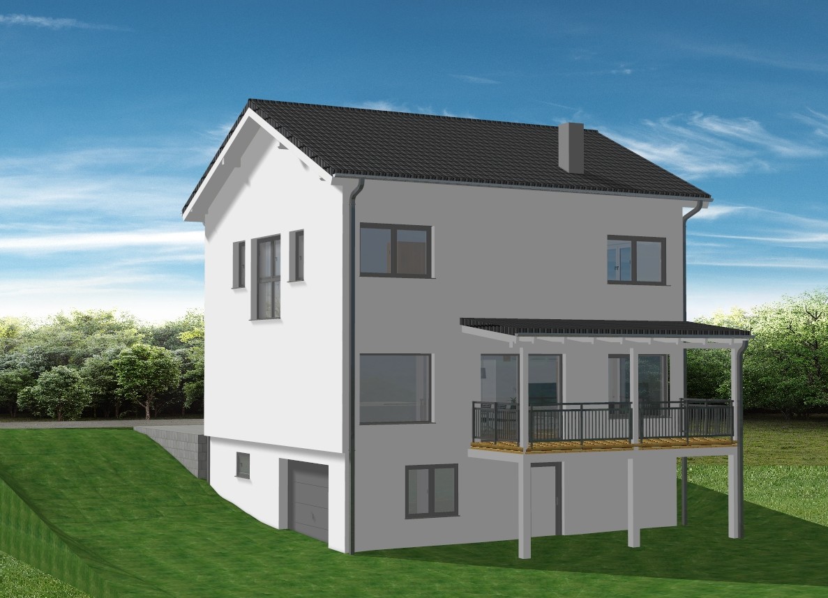 bitte erstelle f r exakt dieses haus eine ralistische au enansicht dachziegel anthrazit fassade wei fenster und garagentor hellgrau bitte erstelle auch von der stra e links oben eine gepflasterte zufahrt zum garagen tor sowie einen gepflasterten platz unter dem bereich des balkons das haus soll in einem elegant modern gestaltetem garten situiert sein