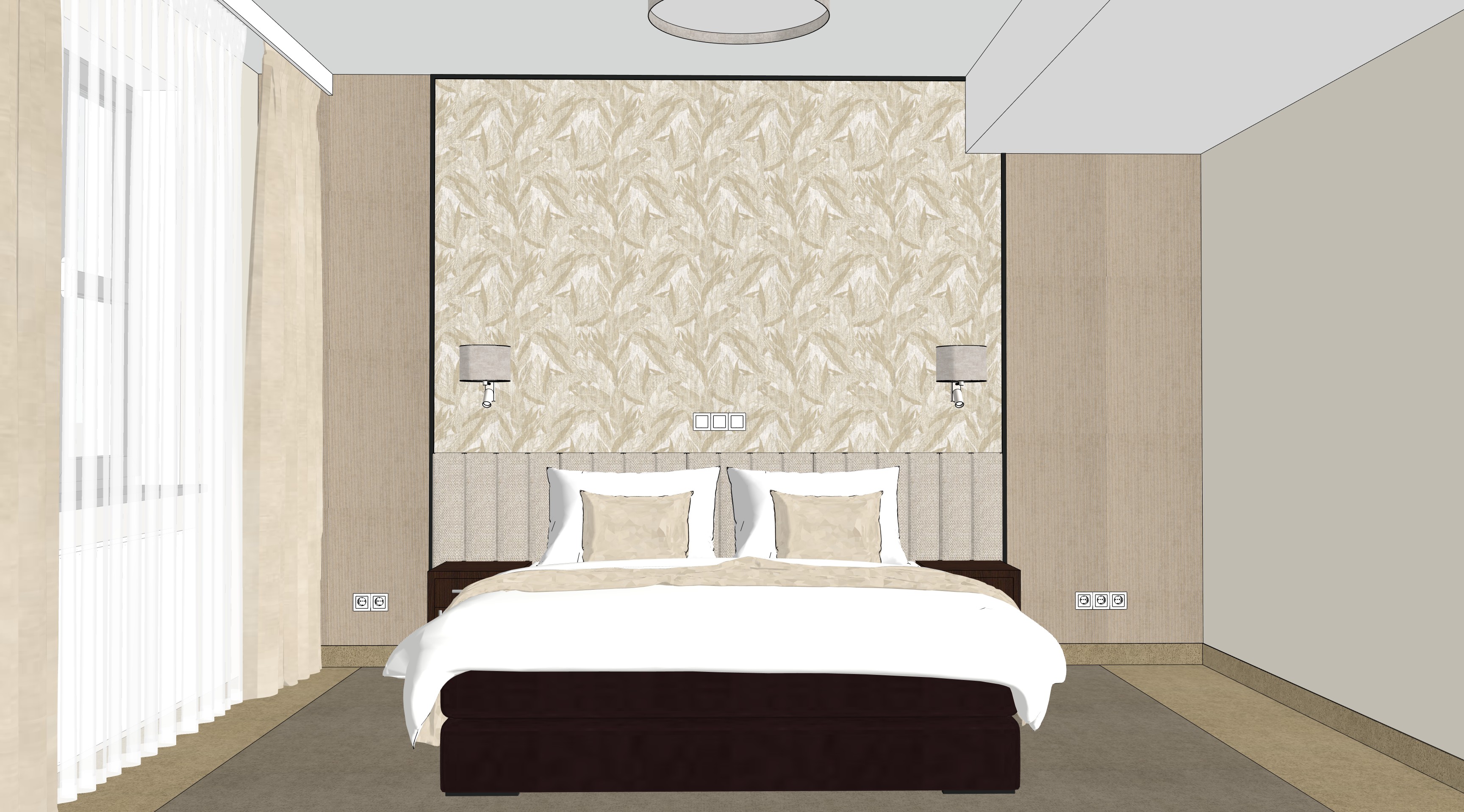 interior shot threr is a carpet on the floor darker inside and lighter around hotel bedroom thera are 18 panels upholster they ar3e the same size there is a carpet on the floor dark inside and light around
