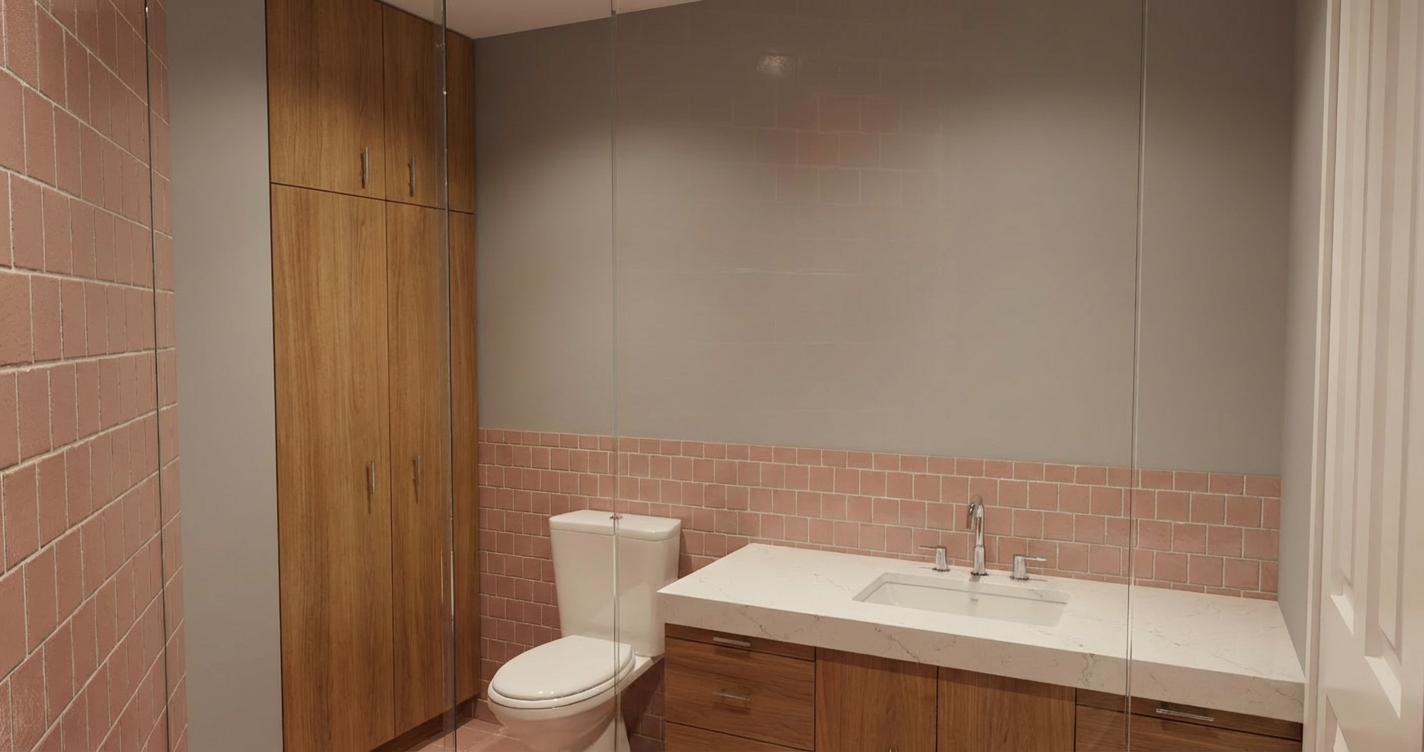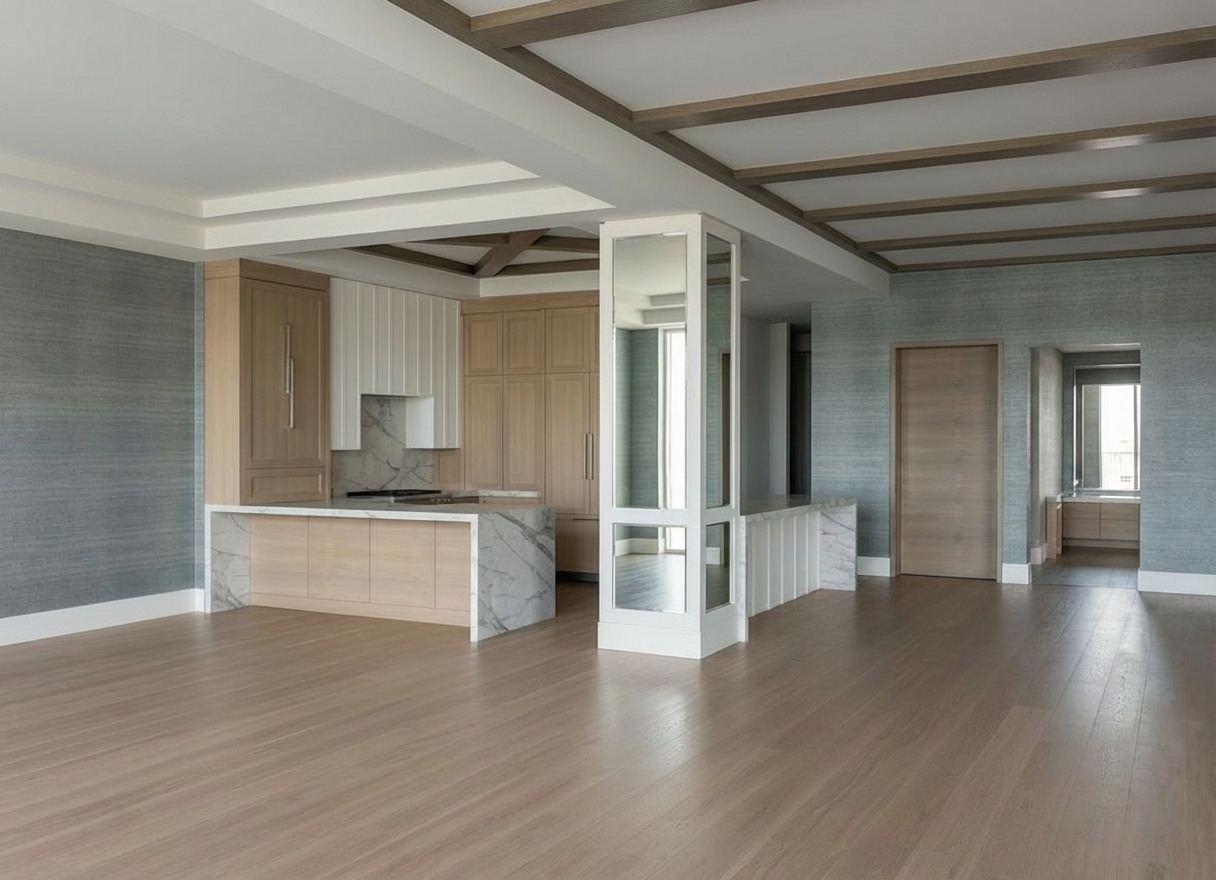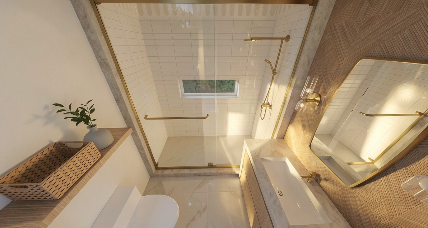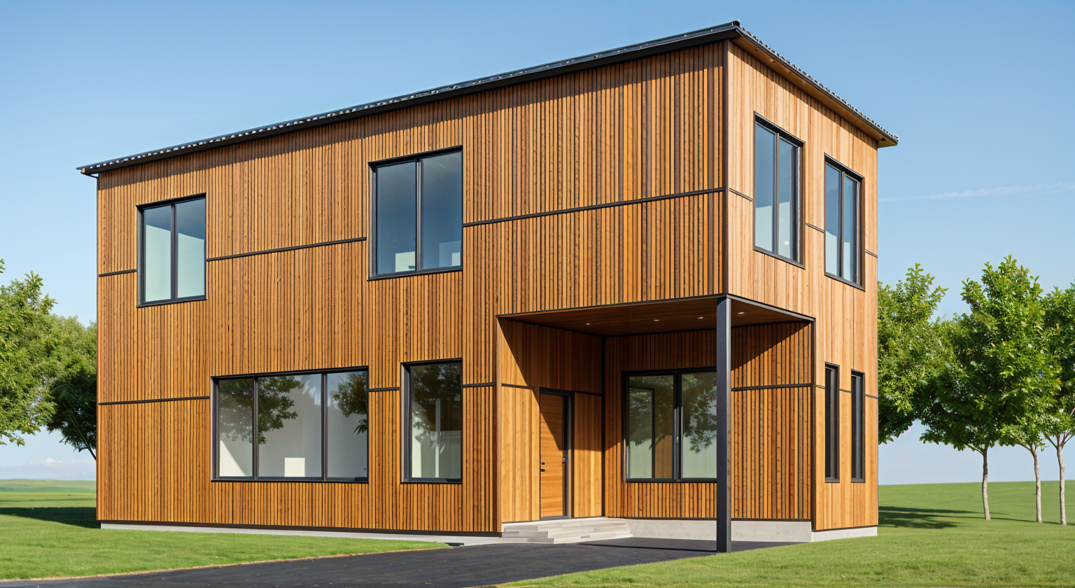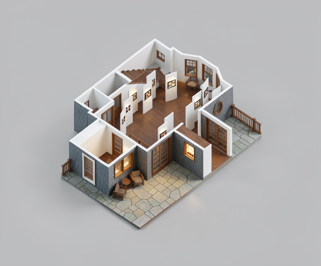 maintain accuracy to original building geometry this is a 3d isometric section view make walls white and floors brown wood colorize the artwork on the gallery wall panels make the stair and exterior railings brown wood exterior patio surface is stone exterior siding is cedar shingle painted gray remove plantings background light gray brighten the ambient light show gallery lighting on artwork remove light from stair landing interior doors are solid