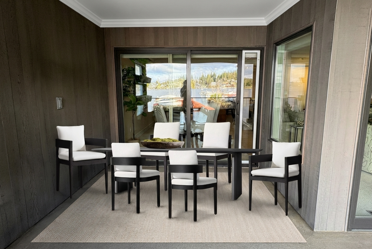 create a realistic photo of this space change the orientation of the table so the long end of the table runs parallel to the left wall add a centerpiece to the table