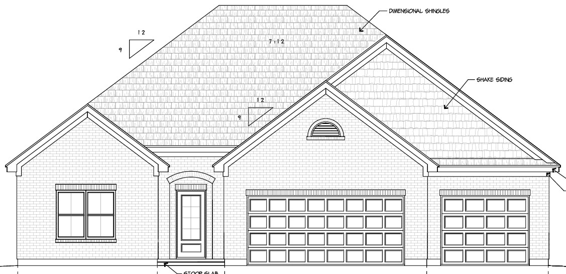 the house exterior is cherokee berkley brick with light brown red and earth tones in it siding is painted in soft cream with soft cream trim to match and black windows the roof is a black adding a refined contrast the main entrance features a black door with full frosted glass garage doors are black heritage long panel with no windows