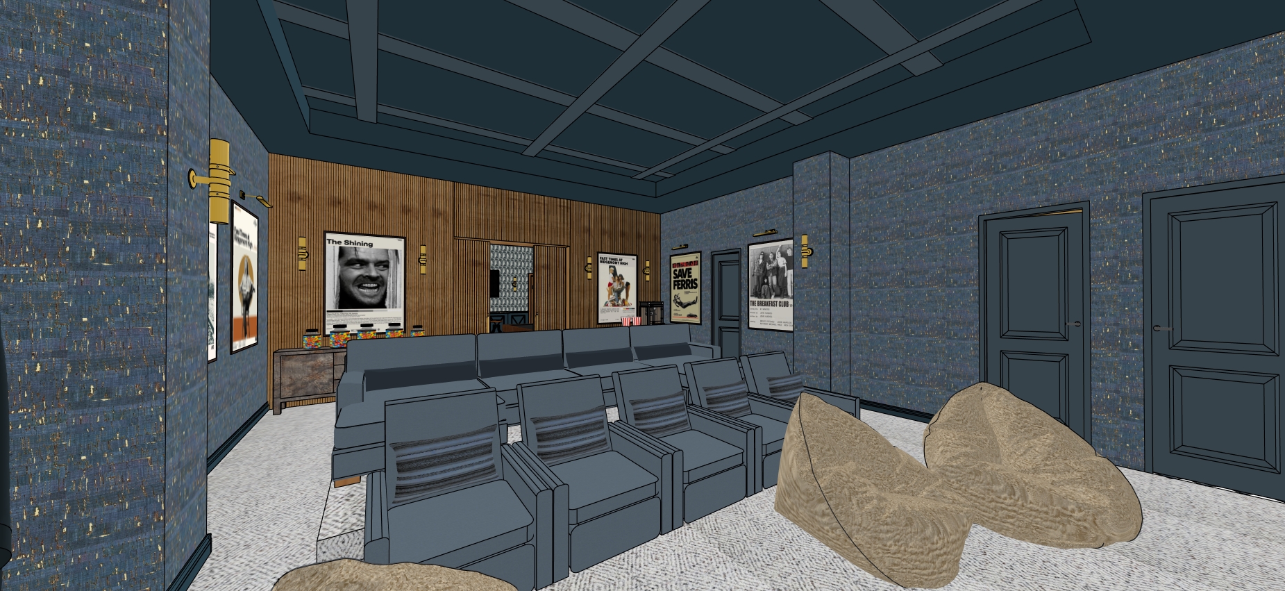 interior shot ceiling high gloss paint movie room velvet blue seating fabric moody lighting bean bags architecture