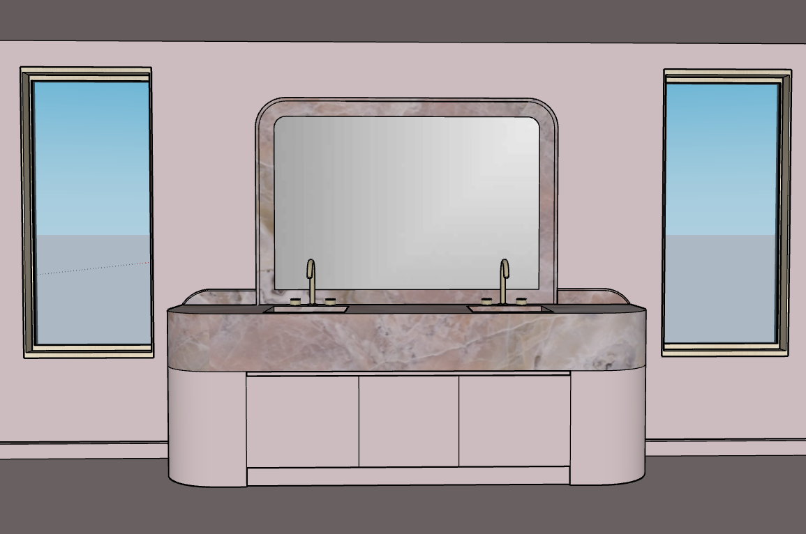 render the space in hyper realistic visualization quality at 8k resolution keep the vanity exactly as shown with all existing textures and materials unchanged the floors walls and ceiling should all use the same continuous light blush limewash texture as in the reference image clearly showing a soft limewash painted finish rather than a flat color the mirror should have a gentle natural reflection so it reads clearly as a real mirror the stone on the vanity and mirror frame should remain identical per image include three small recessed ceiling lights positioned above the vanity through the windows trees should be visible outside to create a natural exterior view the overall image should feel realistic calm and natural with accurate lighting and material texture