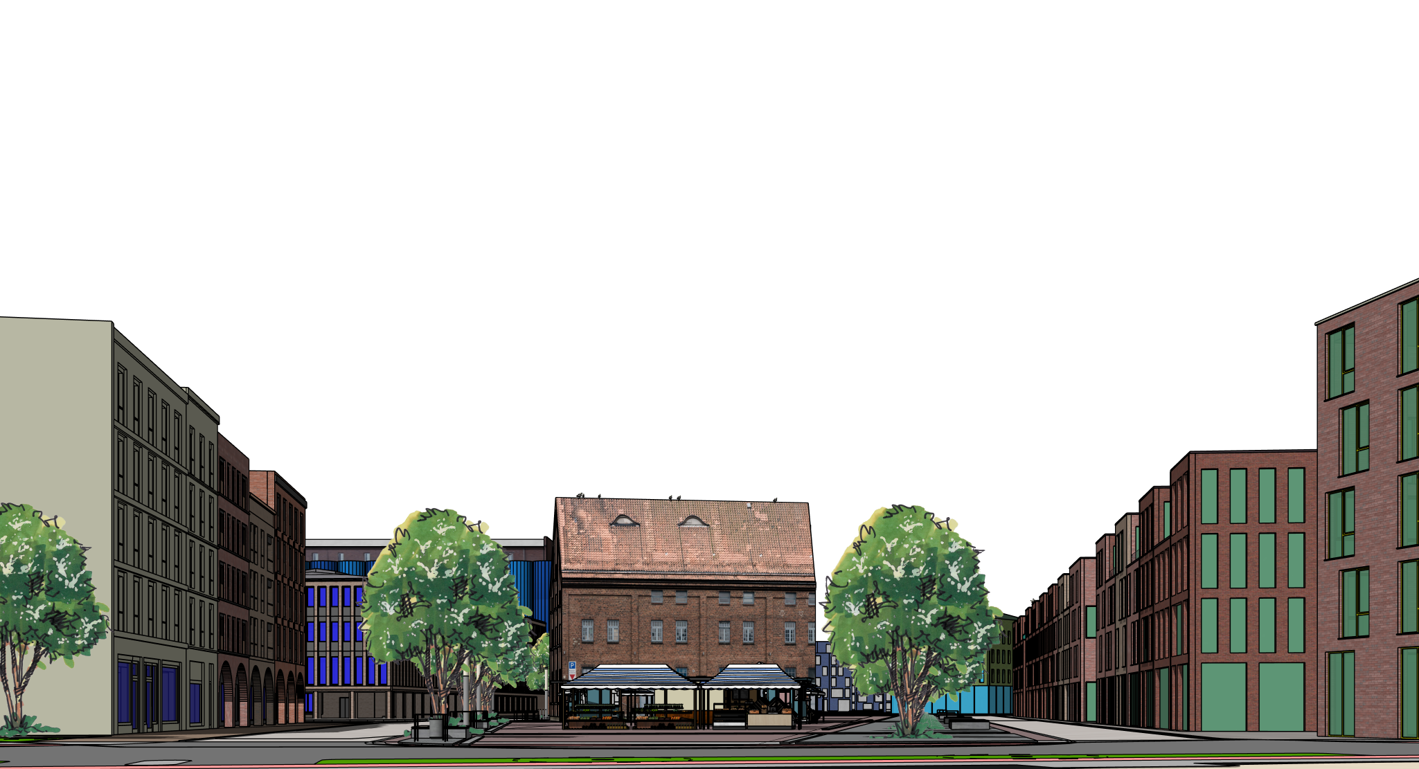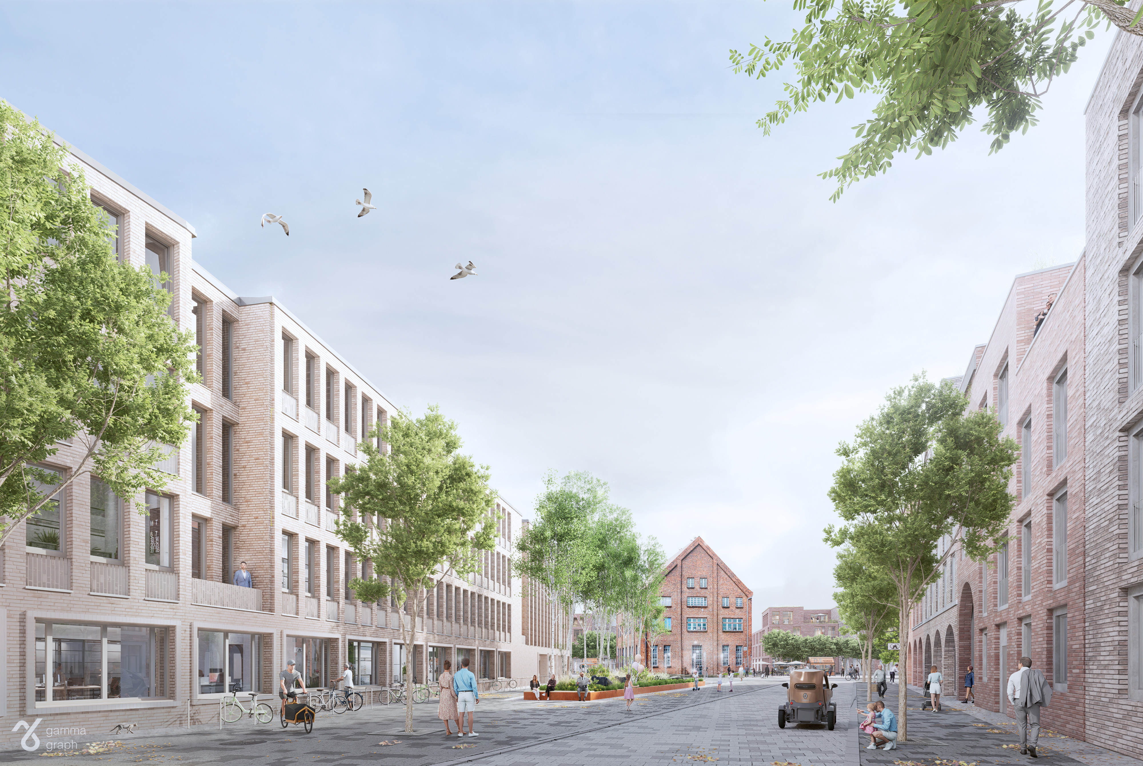 exterior shot a north german urban square featuring a series of elegant brick buildings in warm earthy tones lush green trees with dense foliage are scattered throughout creating a lively refreshing atmosphere the ground is paved with light golden yellow pathways adding contrast to the vibrant greenery the sky above is clear and bright casting a warm welcoming light over the scene enhancing the harmonious balance between nature and architecture