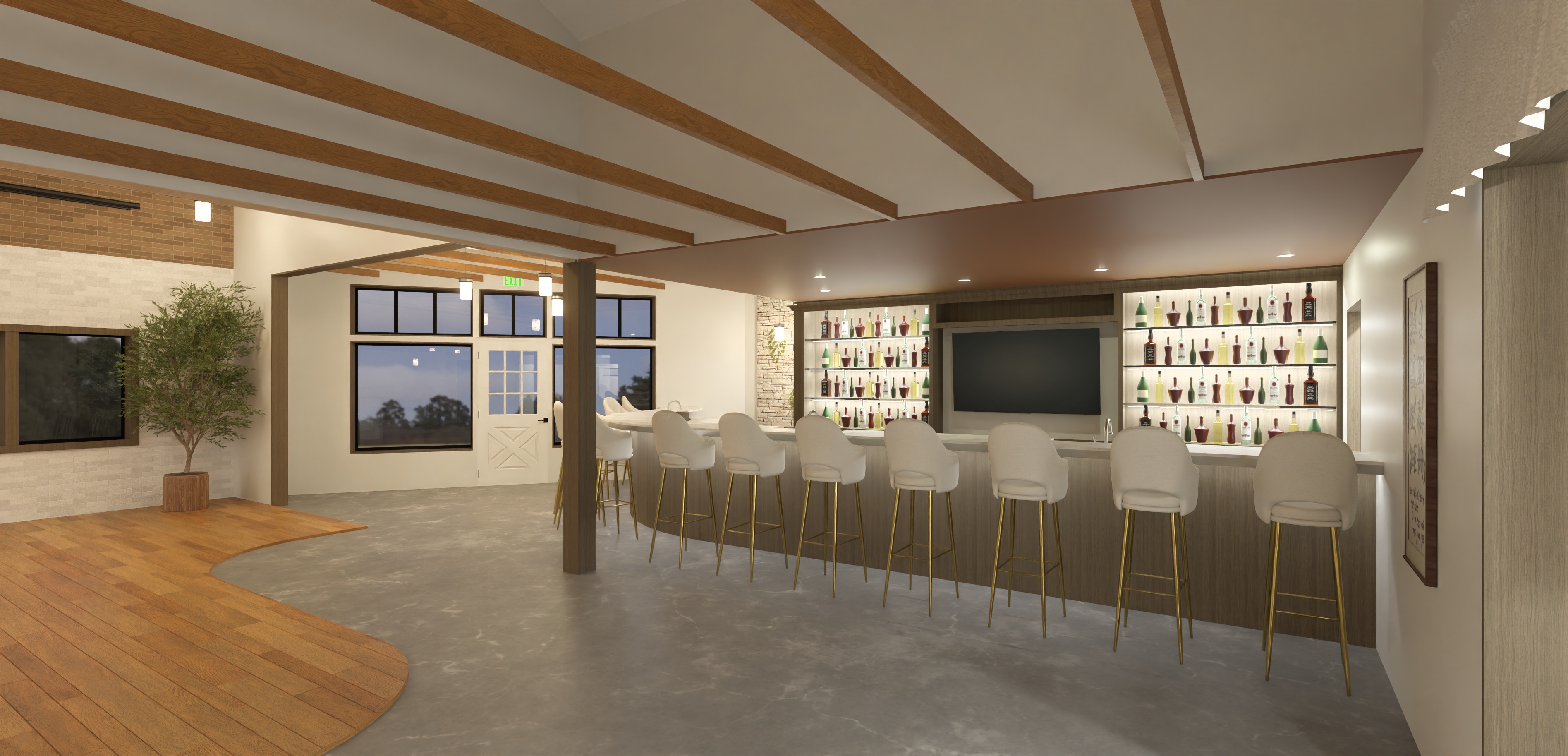 convert this architectural interior rendering of a restaurant bar into a photorealistic image preserve the exact geometry layout proportions and camera angle apply realistic materials textures reflections and lighting use warm modern hospitality lighting appropriate for a japanese inspired bar interior add realistic wood grain stone metal accents glass reflections and soft indirect lighting maintain the original design intent and do not change walls openings cabinetry or furniture layout high end architectural visualization ultra realistic clean composition natural color grading
