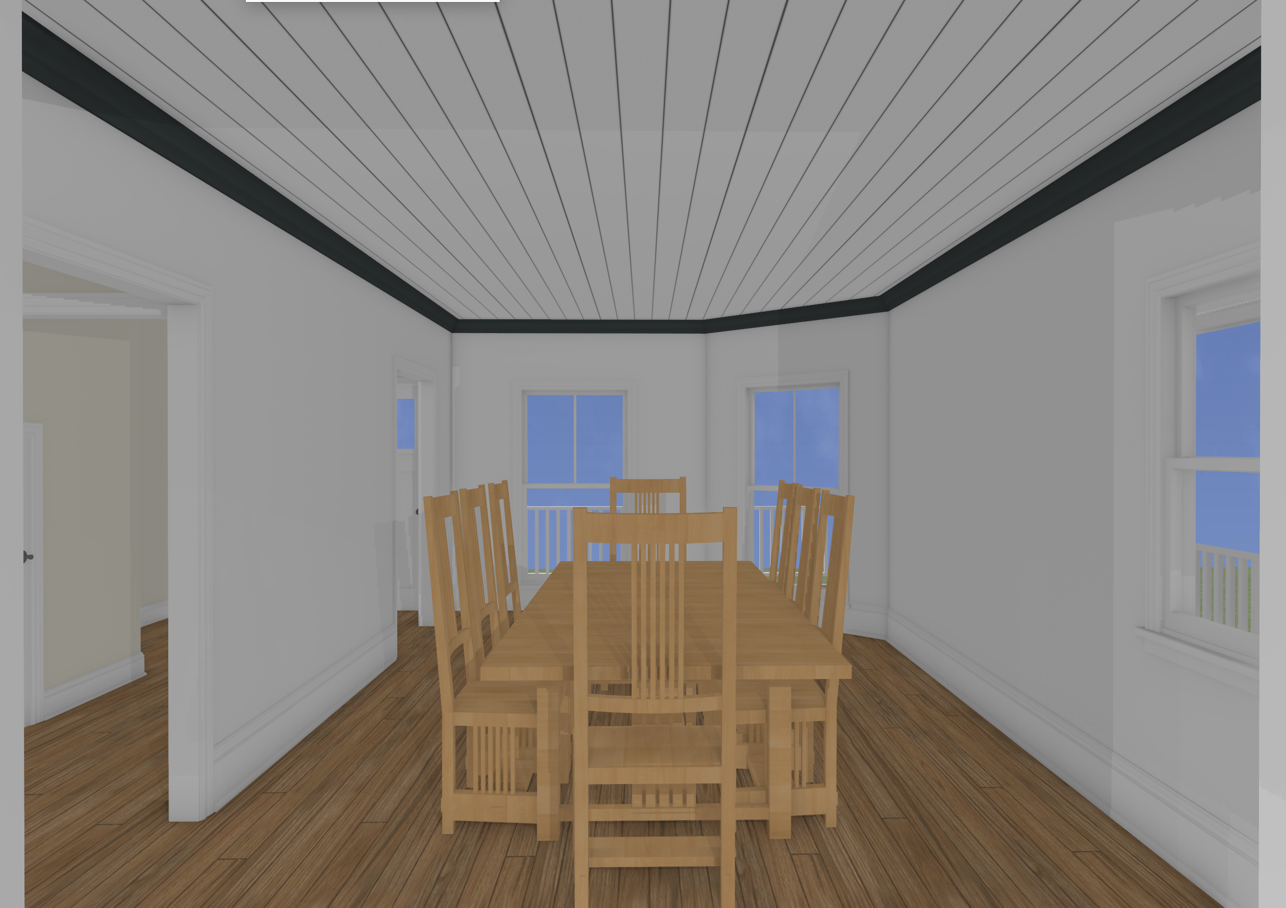 charcoal ship lap ceiling with charcoal crown molding light gray trim with grass cloth wallpaper decorative light fixture over dining table wall sconces