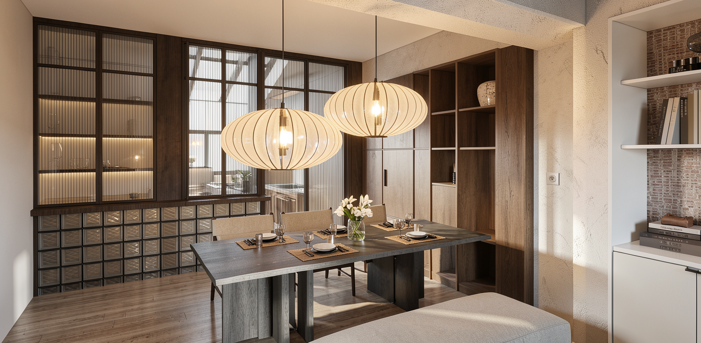 make a photorealistic render wtihout changing the perspectif keep the materials close to the original and put a hanging horizontal ligth the flos belt leather above the kitchenisland no added windows or doors make the picture overal light just at 12 00 dont add a faucet