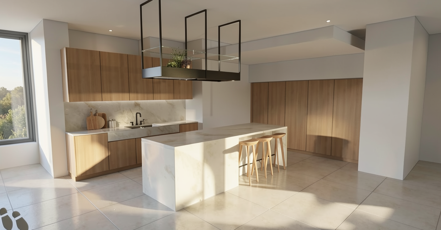 the rendered image should feature clean natural daylight as the dominant light source with soft diffused daylight entering through large openings the lighting should be well balanced avoiding excessive contrast or overexposure while ensuring that details remain clearly visible even in shaded areas the scene should also include 4000 kelvin interior artificial lighting the neutral white tone of this lighting should harmoniously complement the daylight the artificial light must not dominate the scene it should subtly enhance spatial depth and highlight material textures colors must remain accurate and natural with no color shift toward warmer or cooler tones the white balance should be neutral and the render should faithfully represent the original material finishes and shades the overall image should be clean sharp and photorealistic matching the original design as closely as possible in terms of composition proportions and material representation avoid excessive post processing oversaturation or stylization the goal is a realistic and authentic visual presentation behind the windows there is a blurred view of lush green scenery the entrance door has frosted glass do not change the color of the door remove the ceiling lamp do not change the color of the doors and windows do not change the color of the doors and windows