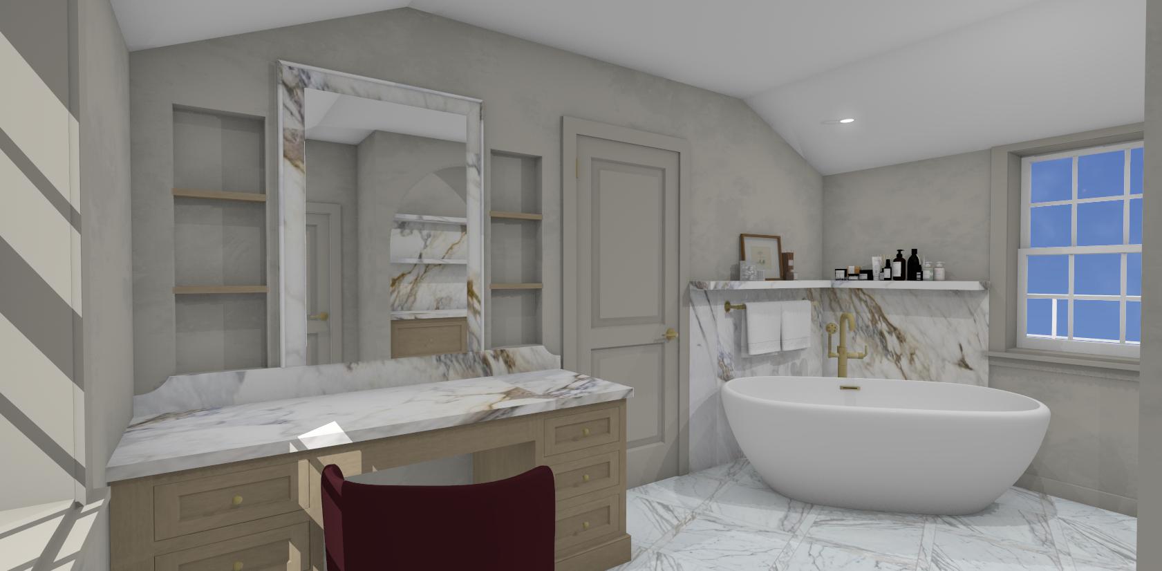 cabinetry should be rift cut white oak wood with a light stain color all marble should be rendered in a honed finish please add cosmetic items to the wall niche shelves at the vanity please also add a soft glow of lighting coming from behind and around the edges of the vanity mirror