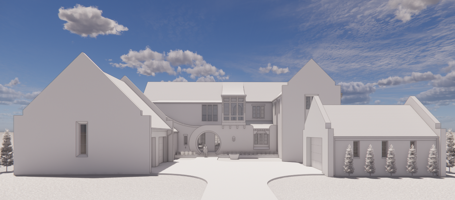 white stucco parapet walls with concrete caps soft blue sunset sky with hues of pink and orange scattered clouds narrow framed dark steel windows with dark trim very small black river stones in lawn no grass up light house more lighting through windows more ambient brightness on house make overall image brighter modern landscaping dark siding infill between upper and lower windows on the right dark siding and trim at center tower windows darker roof more light coming through windows make overall image brighter more landscape plants and lighting in the foreground more brightness on the house add pathway landscape and lighting to front sidewalk