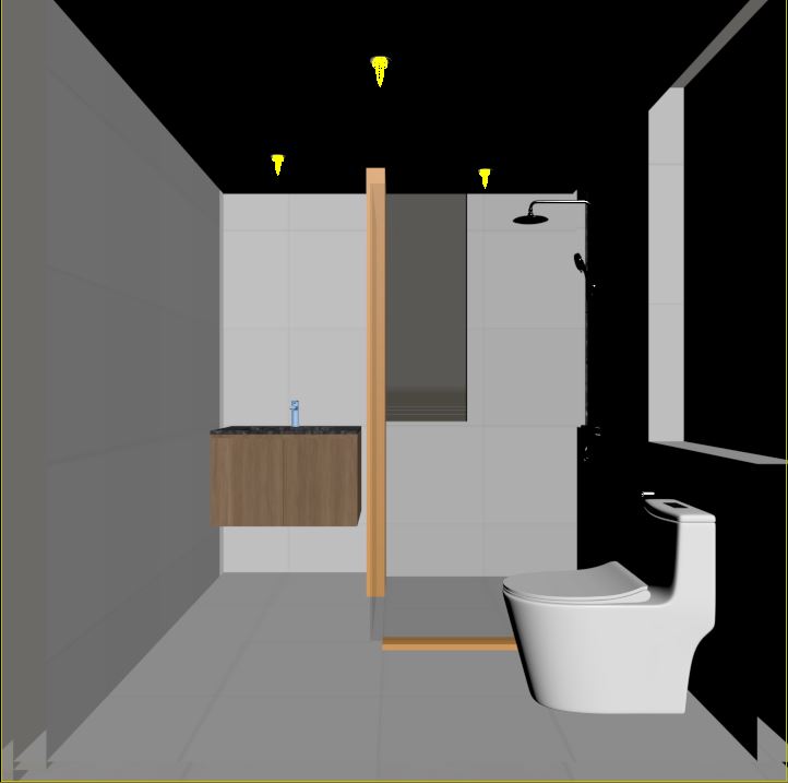 create a modern bathroom interior with a sleek minimalist design the walls and floor are covered in light gray tiles providing a clean and spacious feel add a wooden floating vanity with a polished black countertop featuring a subtle grain pattern incorporate a clear glass partition separating the shower area with a simple black showerhead and fixtures the toilet is a contemporary white design illuminate the space with soft warm white lights for a cozy and inviting atmosphere include a large window on the right allowing natural light to enhance the serene ambiance architecture
