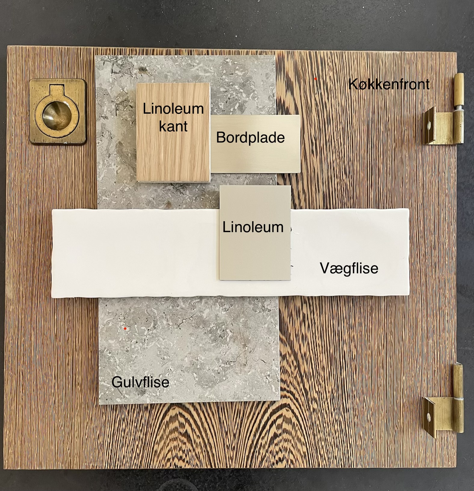 visualize a kitchen in these material and color combinations the architectural of the kitchens should be two i s in front of each other one side in a light beige linoleum and the other side in the showing wood with integrated patinated brass handles
