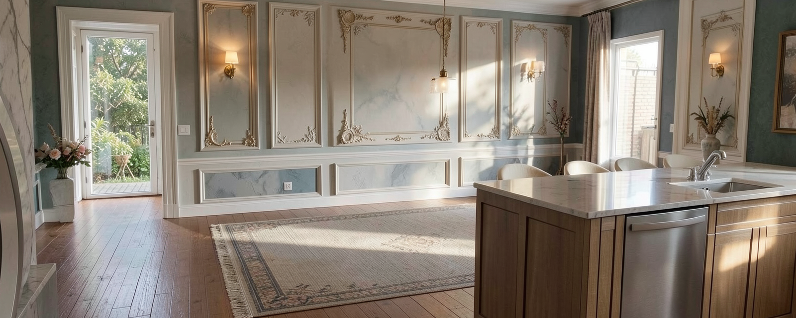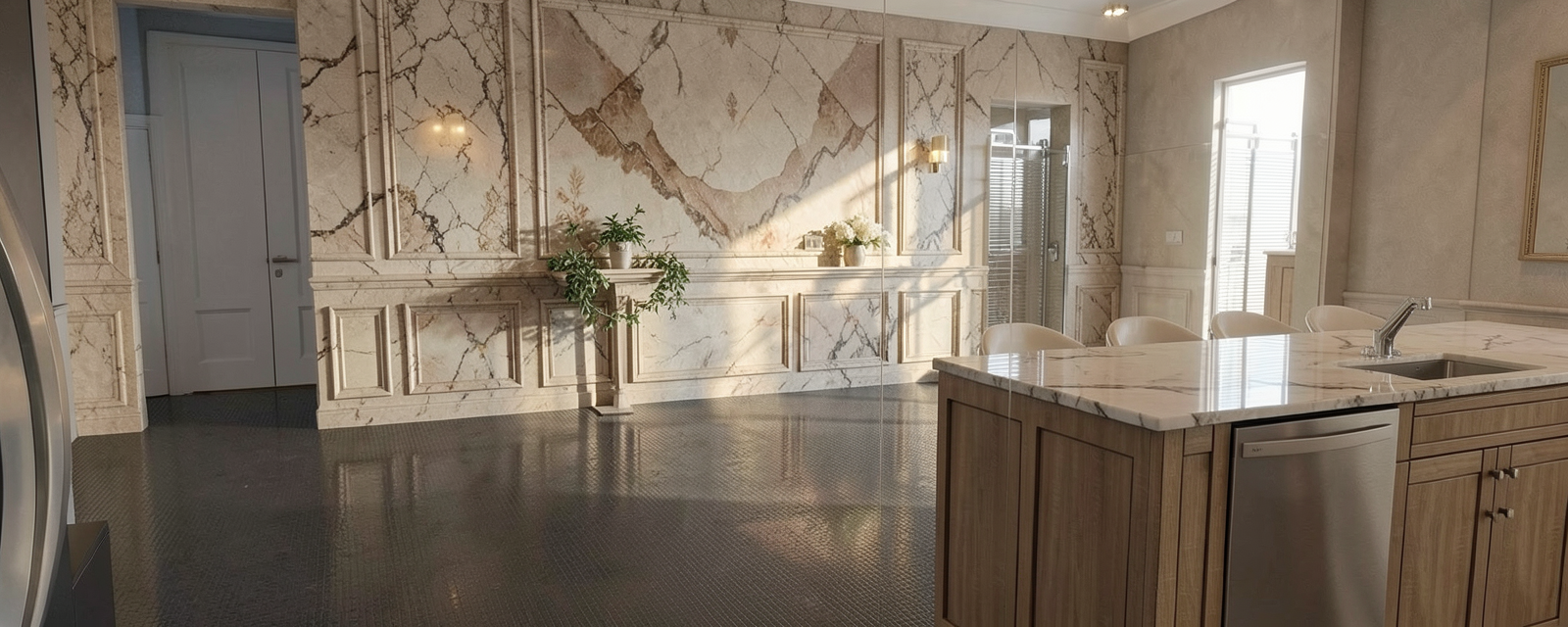 daylight azure tiles 4 by 4 behind banquette and terrazzo floor