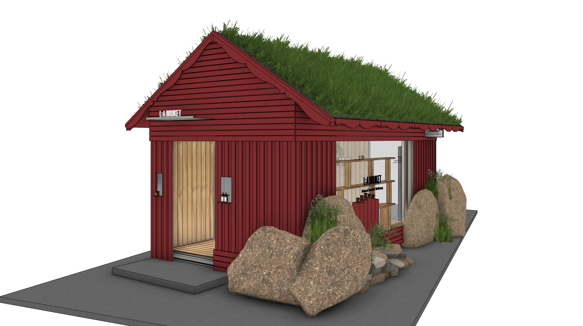 constraints preserve original geometry exactly no changes to form proportions or openings maintain original camera perspective environment dusk scene with pools of steet lights bright enough to expose all the textures in the scene urban context concrete pavement ground plane surrounding buildings modern architecture with concrete fa ades blurry skyscrapers enviroment should look secondary to the red house roof the most important on the roof add natural high wild grass and little bit of small wild flowers it must look super realistic materials details main fa ade change red colour surface into falu red painted timber planks cladding visible photo realistic wood pattern windows add reflective glazing roof natural green vegetation with wild herbs and flowers stones create natural looking brown shades of granite rough texture vegetation exchange the plants with realistic looking wild grass and herbs dont change their position only make it more realistic slightly unstructured organic growth contrasting with urban setting background include urban trees typical for a city environment lighting rendering add soft glowing light in the window moody nighlight realistic shadows global illumination high detail physically accurate materials balanced contrast cinematic warm tone