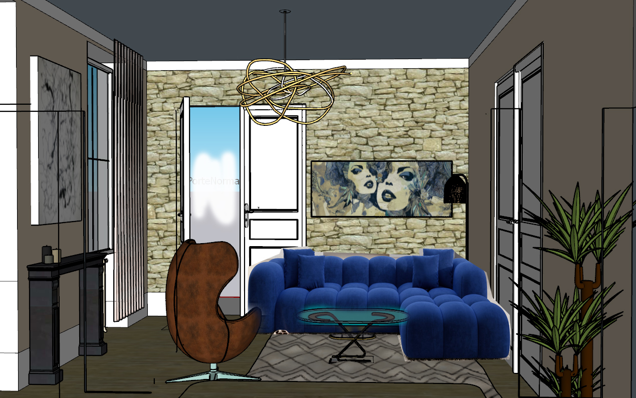 canap tissu bleu lectrique lustre allum parquet blanc mur pierre de taille porte boiserie blanche