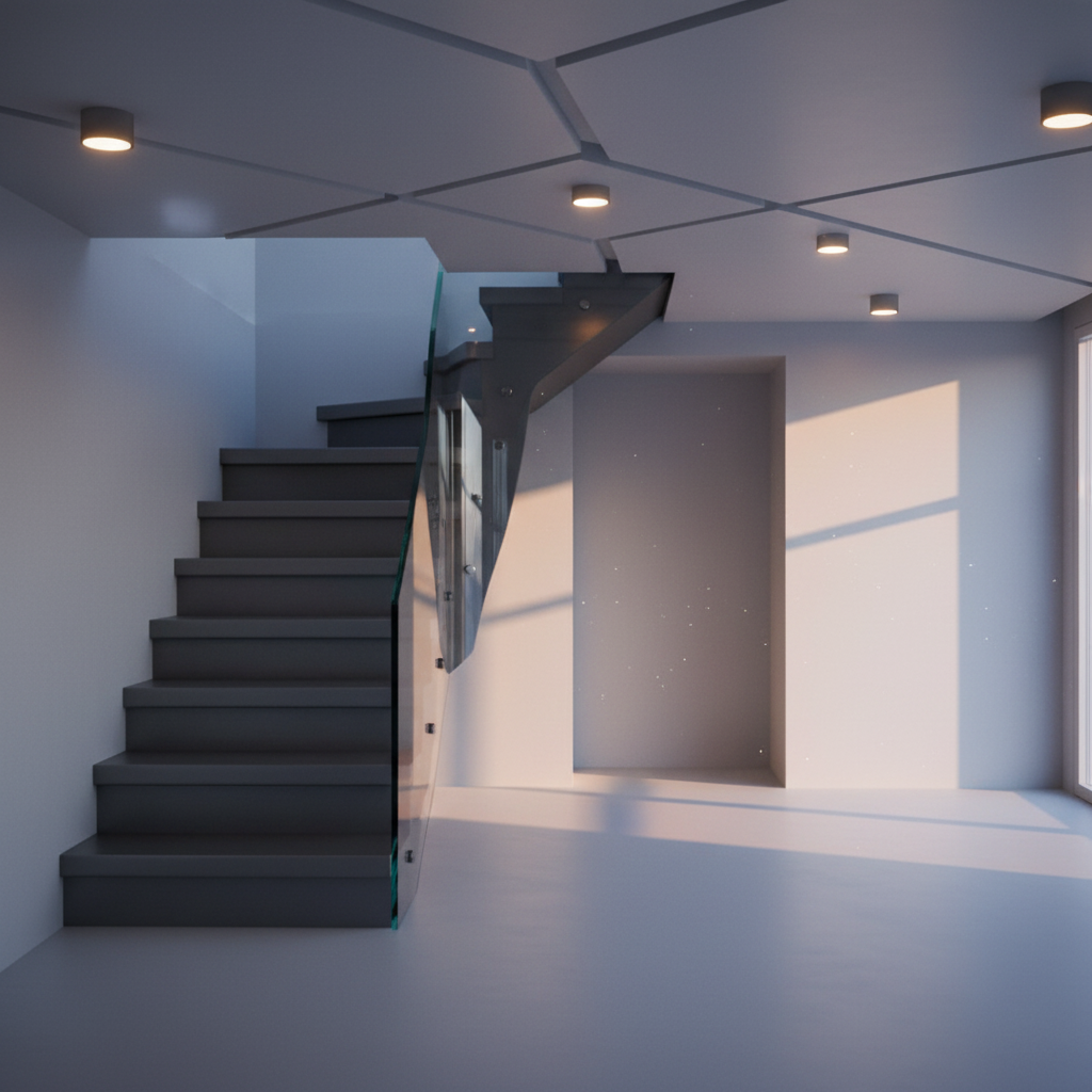 a modern suburban house with a minimalist architectural design the exterior is covered in light grey stone with a dark grey gabled roof the large double garage doors are a warm brown wood the cement driveway is smooth and expansive leading onto vibrant green grass that surrounds the home suggesting a well kept lawn the scene is set against a bright blue sky with soft white clouds capturing a serene sunny day atmosphere the overall mood is peaceful and inviting emphasizing a sense of comfort and homeliness