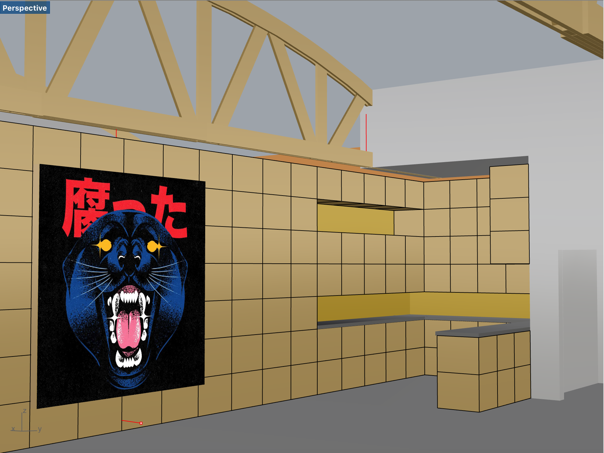 douglas fir millwork douglas fir truss yellow tile kitchen backsplash concrete countertops polished concrete floor