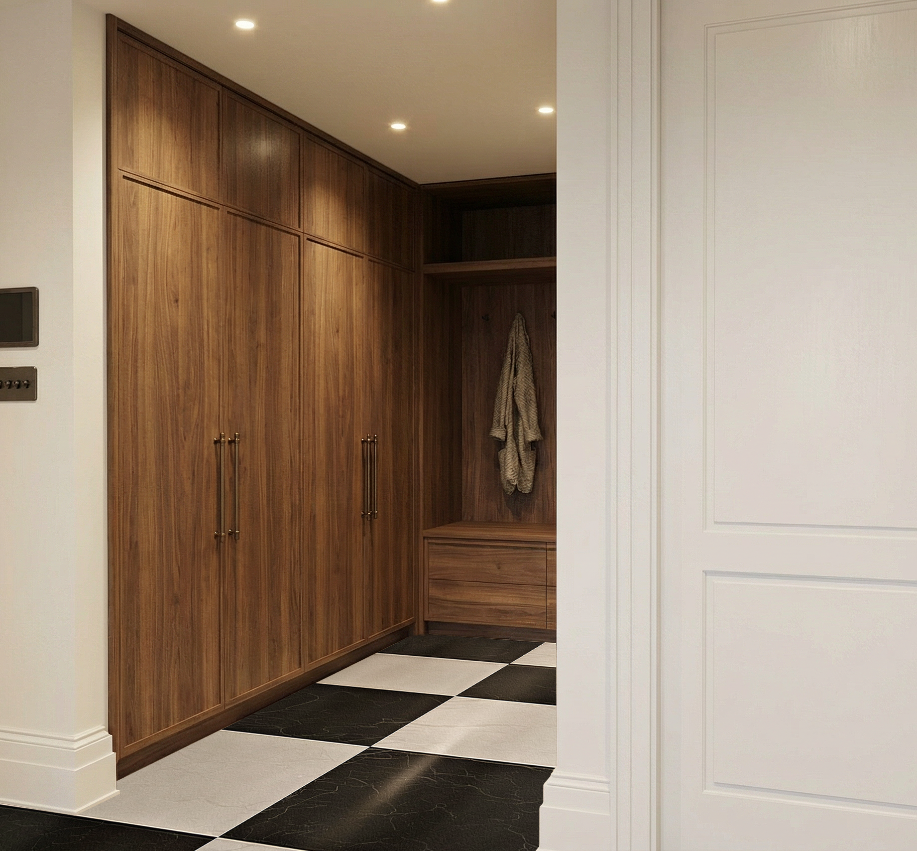 render a beautifully detailed entryway with a warm and inviting atmosphere the main focus is on a sleek set of wooden closets with a rich walnut finish paired with elegant gold handles the floor is a classic black and white checkerboard pattern creating a striking visual contrast the walls are painted a soft cream adding a cozy ambiance to the space subtle warm lighting from recessed ceiling lights enhances the texture of the wood and the sheen of the floor a soft beige jacket hangs casually adding a touch of lived in charm to the scene
