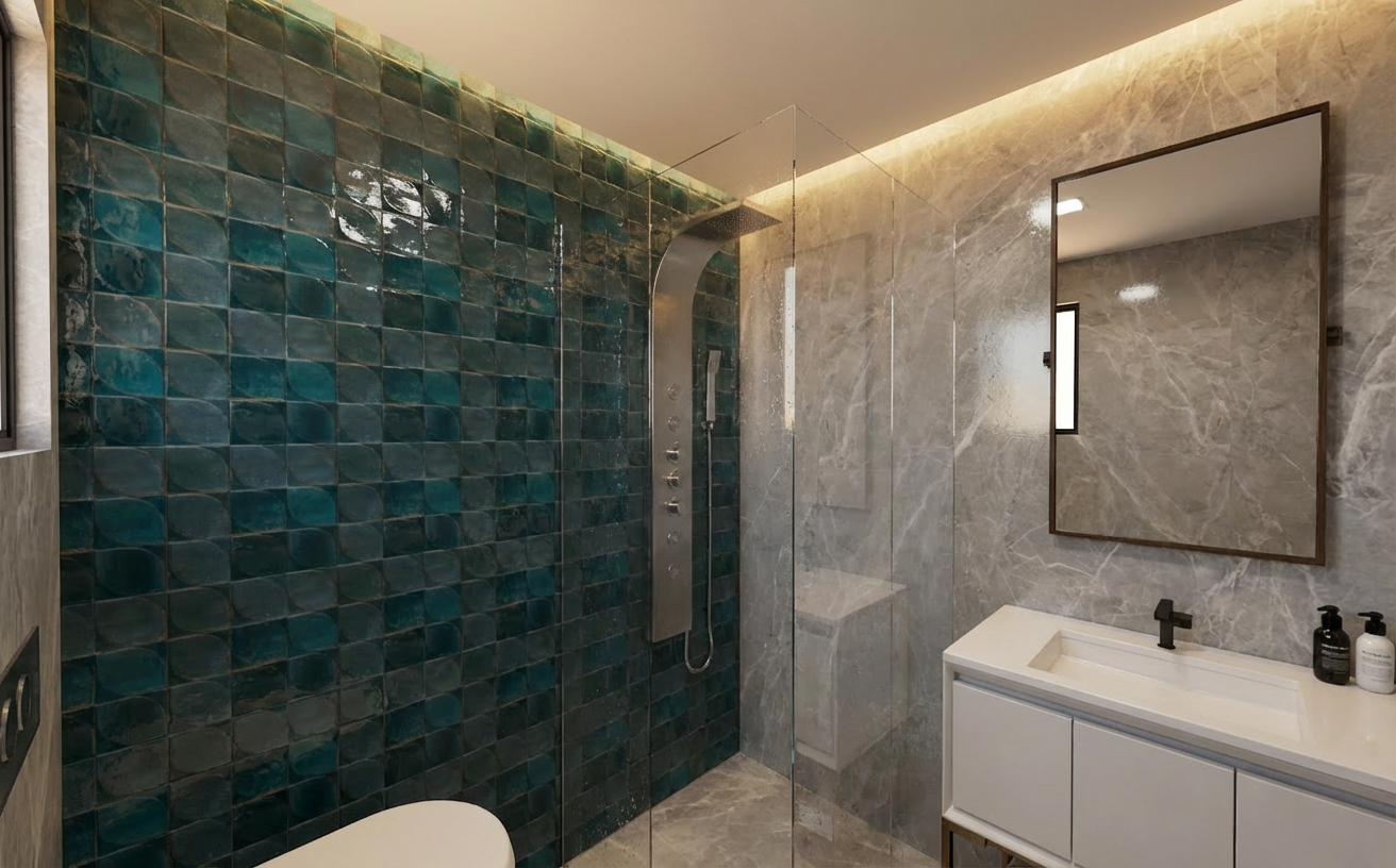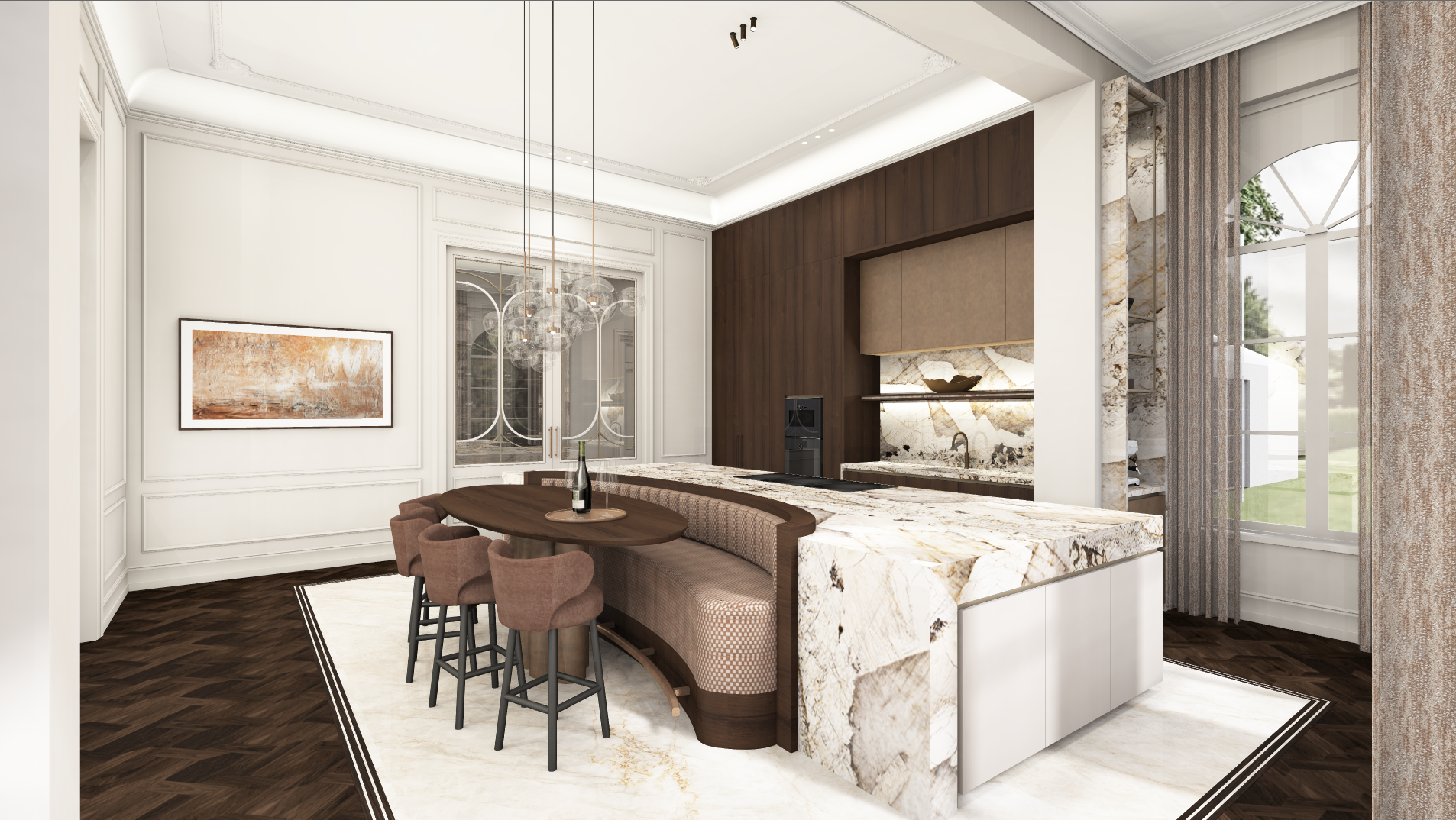 convert this interior image into an ultra photorealistic render while strictly preserving the exact geometry proportions composition layout and camera perspective of the original image do not alter any dimensions shapes furniture placement or spatial relationships all colors must remain exactly the same as in the original image no reinterpretation or color shifts enhance all interior materials to high end realistic finishes while matching the original colors precisely walls floors ceilings and furniture should receive accurate material definition wood grain stone texture fabrics metals etc add subtle texture variation depth reflections and micro imperfections ensure physically correct material behavior matte vs gloss reflections light absorption apply highly realistic interior lighting natural daylight entering through windows with soft realistic diffusion accurate shadow behavior and soft shadow transitions physically correct light bounce between surfaces global illumination balanced interior exposure with natural contrast no overexposure enhance spatial depth and atmosphere realistic ambient occlusion in corners and junctions subtle depth of field if appropriate natural contrast and tonal balance maintain a refined high end architectural interior visualization style calm clean and luxurious appearance realistic material richness without exaggeration do not add remove or redesign any elements only enhance realism of the existing interior behind the glass doors on the left is a corridor with wine bottle display leave the artpiece as is