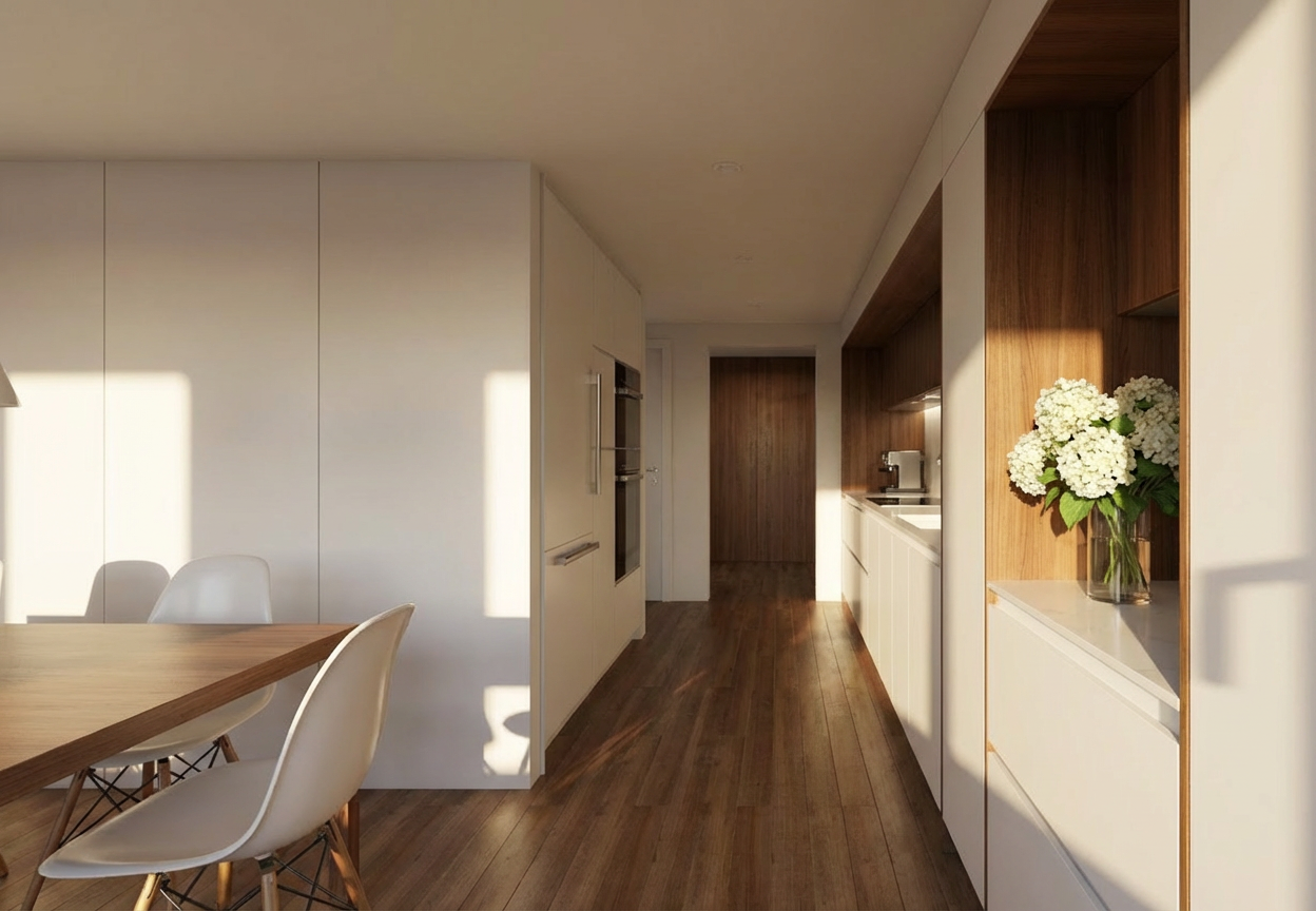 add white hydrangea flowers on the island moody light sunny light from the windows white cabinets in high gloss do not change cabinets nor add open shelves don t add new cabinets