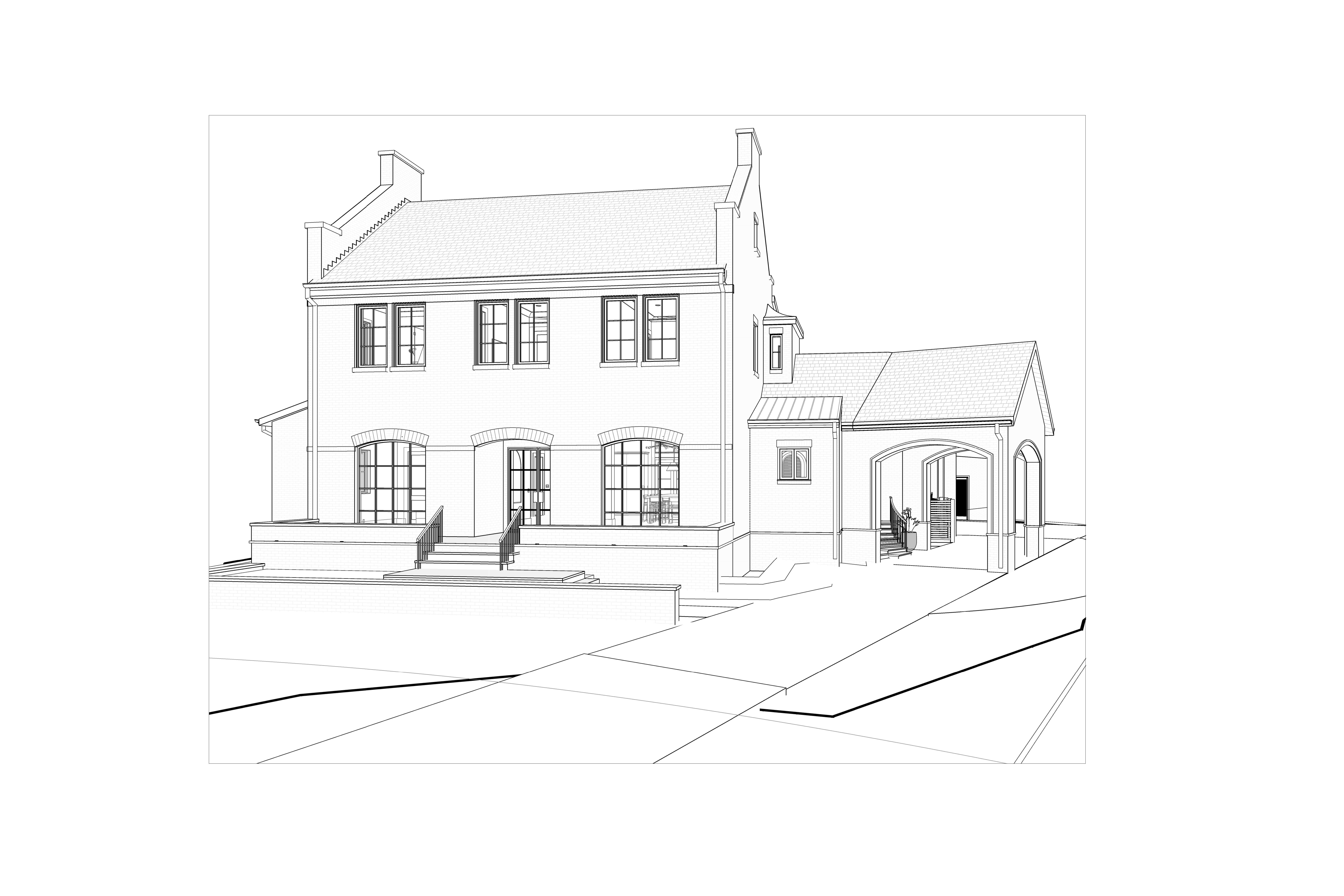 house on slight hill off white painted brick copper gutters and downspouts dark blue grey slate roof black frame windows downstairs white frame windows upstairs grass front yard and curved paved driveway with pick up truck morning light low move bayou river with no trees behind house to far rear of image low bushes to left and right of stair railing small orange red maple tree to left closer to house pick up truck move house a little further back from street keep driveway the same remove bushes add bushes in front of low brick wall