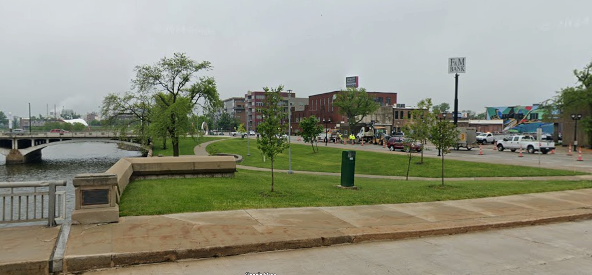 make a dark evening scene with light sculptures along the sidewalk between the lawn spaces add people