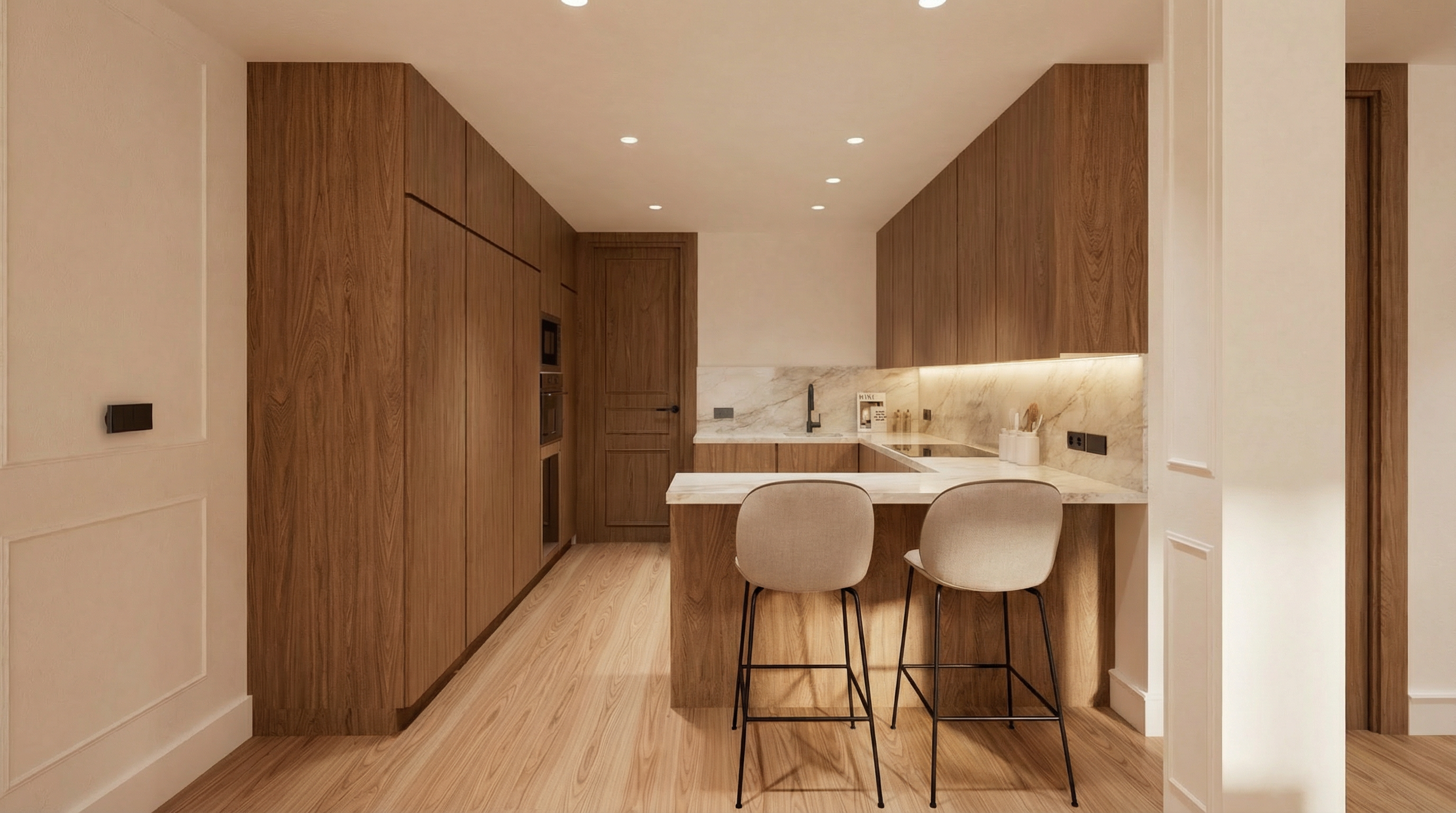 modern city villa light color facade with applied wooden details night scene with lights on blue sky courtyard perspective view