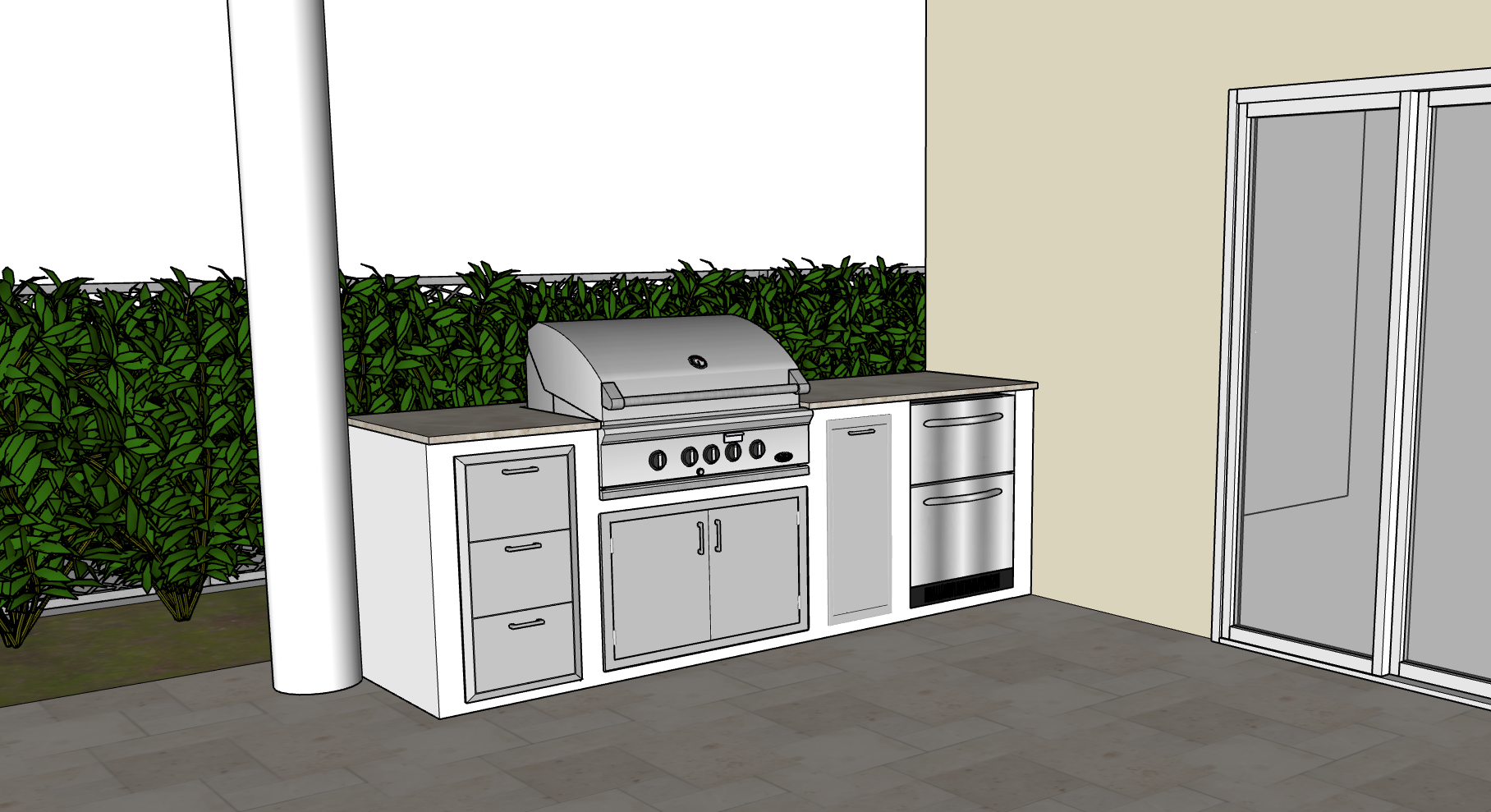 photorealistic architectural render of an outdoor kitchen built in island viewed from a slightly elevated front facing angle the kitchen features a stainless steel built in gas grill 4 burners dome lid open revealing the grill grates with food cooking on them such as steaks burgers and corn to the left of the grill a triple stainless steel drawer stack with bar pulls below the grill double stainless steel access doors to the right of the grill one single access door panel and on the far right a stainless steel double drawer refrigerator unit with a black ventilation grille at the base the cabinet body is cream off white the countertop is a beige taupe stone or porcelain slab with food items and condiments placed on it such as a cutting board fresh vegetables wine glasses and a serving platter the floor is large format beige travertine look porcelain tile a white round structural column is positioned to the left of the island a sliding glass door is partially visible on the right edge the background features a dense green hedge shrub wall a couple is present a man standing at the grill tending to the food with tongs and a woman standing nearby smiling and holding a wine glass both casually dressed in summer clothes a dog medium sized friendly breed is sitting or lying on the tile floor near the couple relaxed and attentive late afternoon golden hour lighting with warm vivid colors strong projected shadows cast across the tile floor and cabinet faces high contrast sharp details photorealistic quality