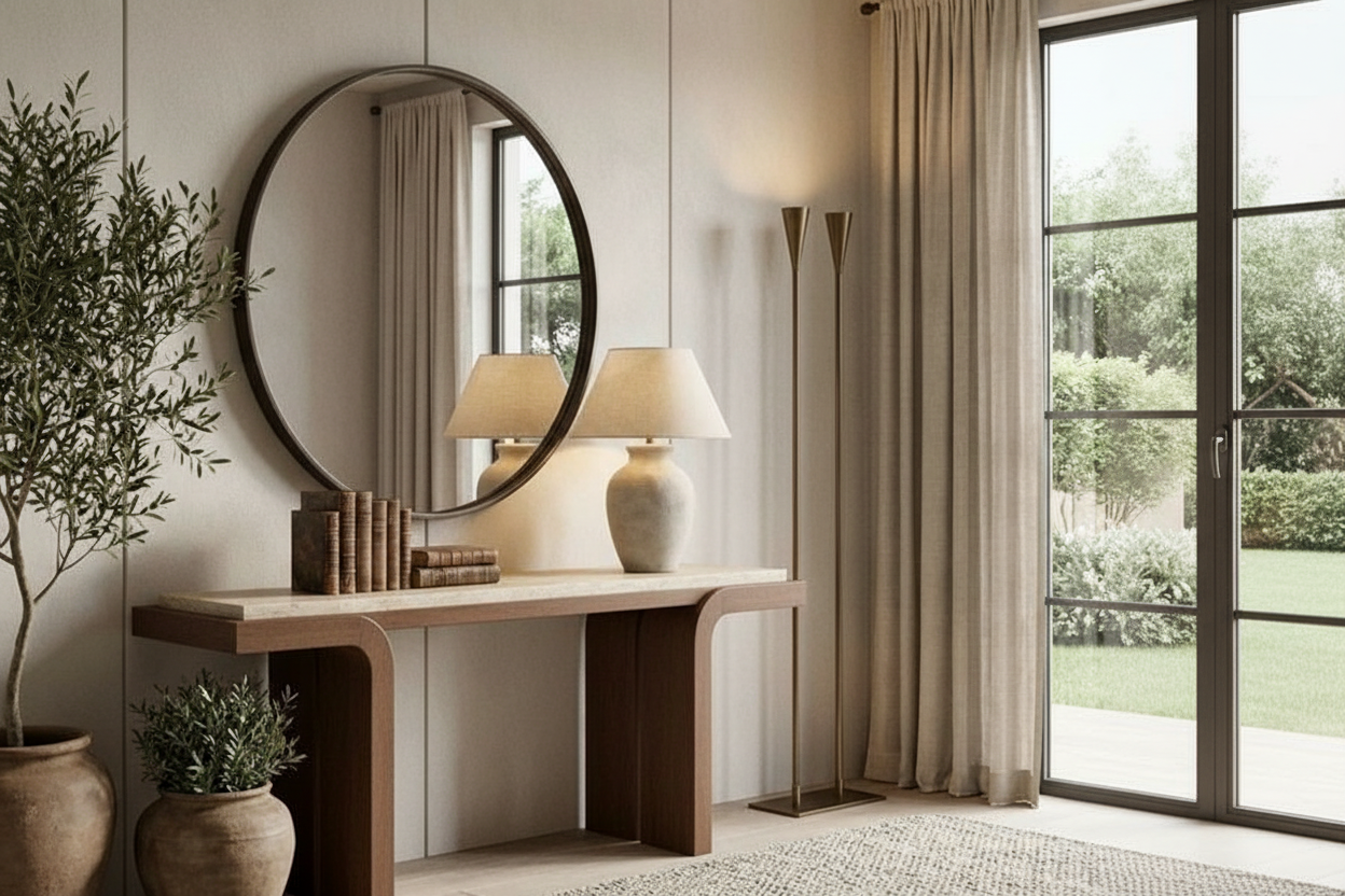 a modern cozy living room with a sophisticated atmosphere in the center a plush brown sofa sits on a light beige rug adjacent is a sleek silver metallic coffee table reflecting ambient light wooden accents are visible on the walls adding warmth and contrast the room features a striking blue bench offering a pop of color an elegant black arched floor lamp provides soft lighting enhancing the tranquil environment natural tones of beige and brown dominate with subtle highlights from decorative objects on the shelves contributing to a serene and stylish space
